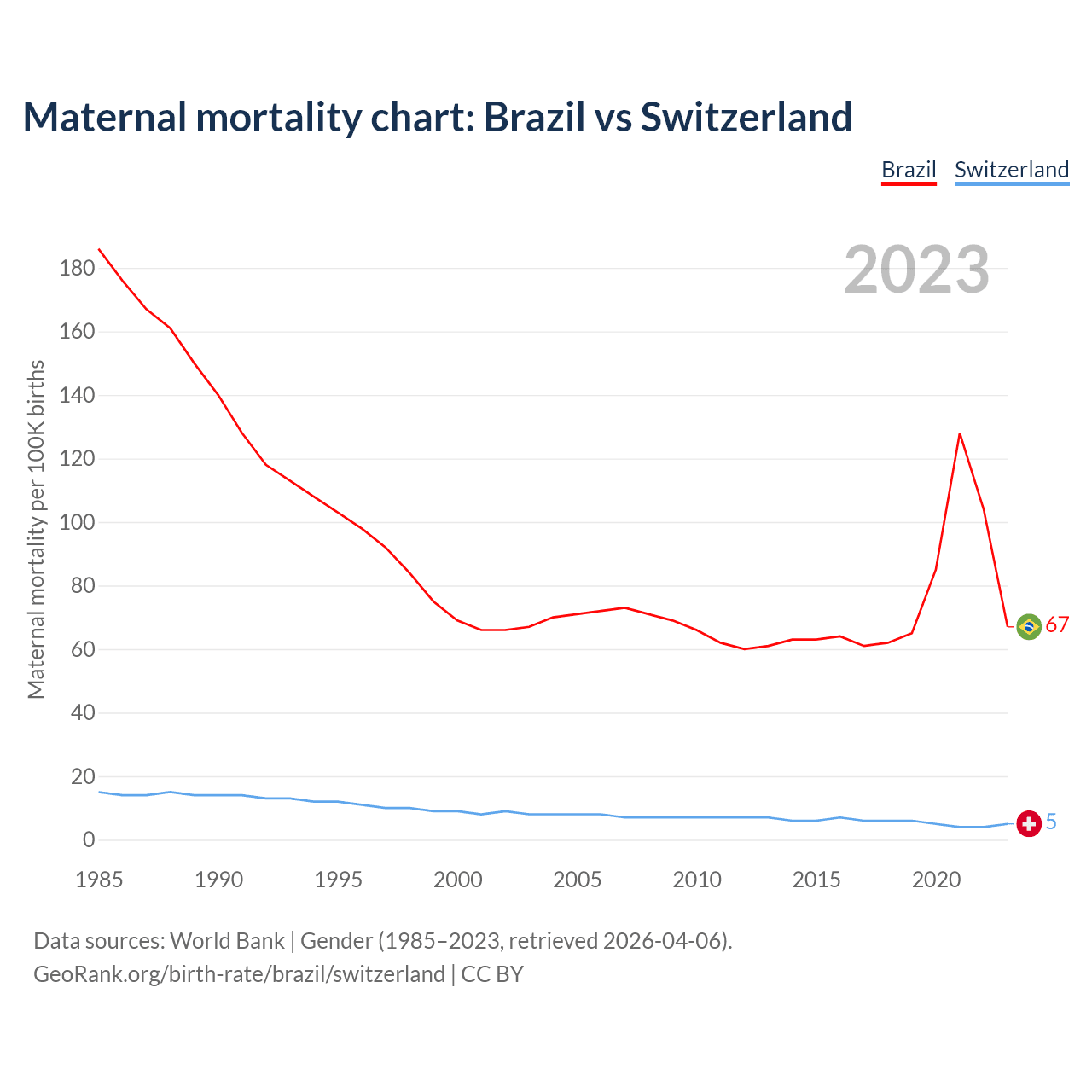 The maternal mortality rate, which is the probability of dying during childbirth or within 42 days of pregnancy termination, is 67 deaths per 100,000 live births in Brazil, compared to 5 deaths in Switzerland.