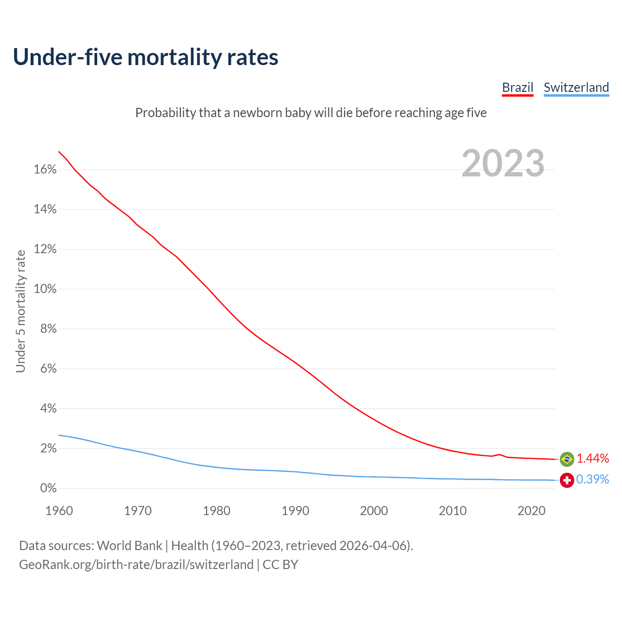 The chance that a newborn baby will die before reaching age five is 1.44% in Brazil and 0.39% in Switzerland. Above is a chart with historical data on under-five mortality rates.