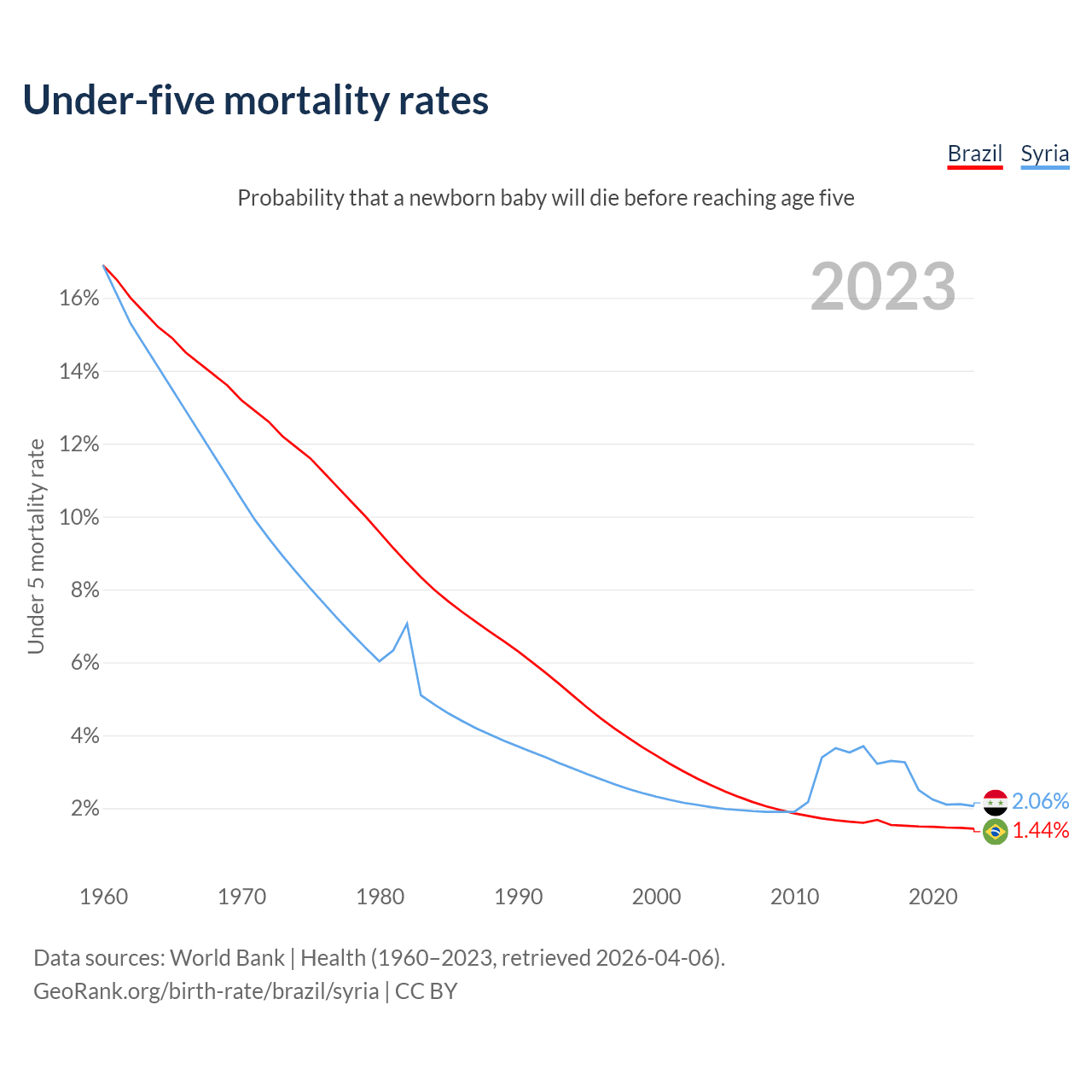 The chance that a newborn baby will die before reaching age five is 1.44% in Brazil and 2.06% in Syria. Above is a chart with historical data on under-five mortality rates.