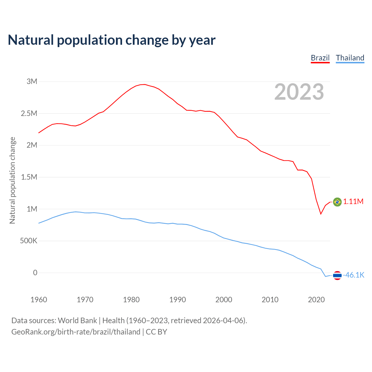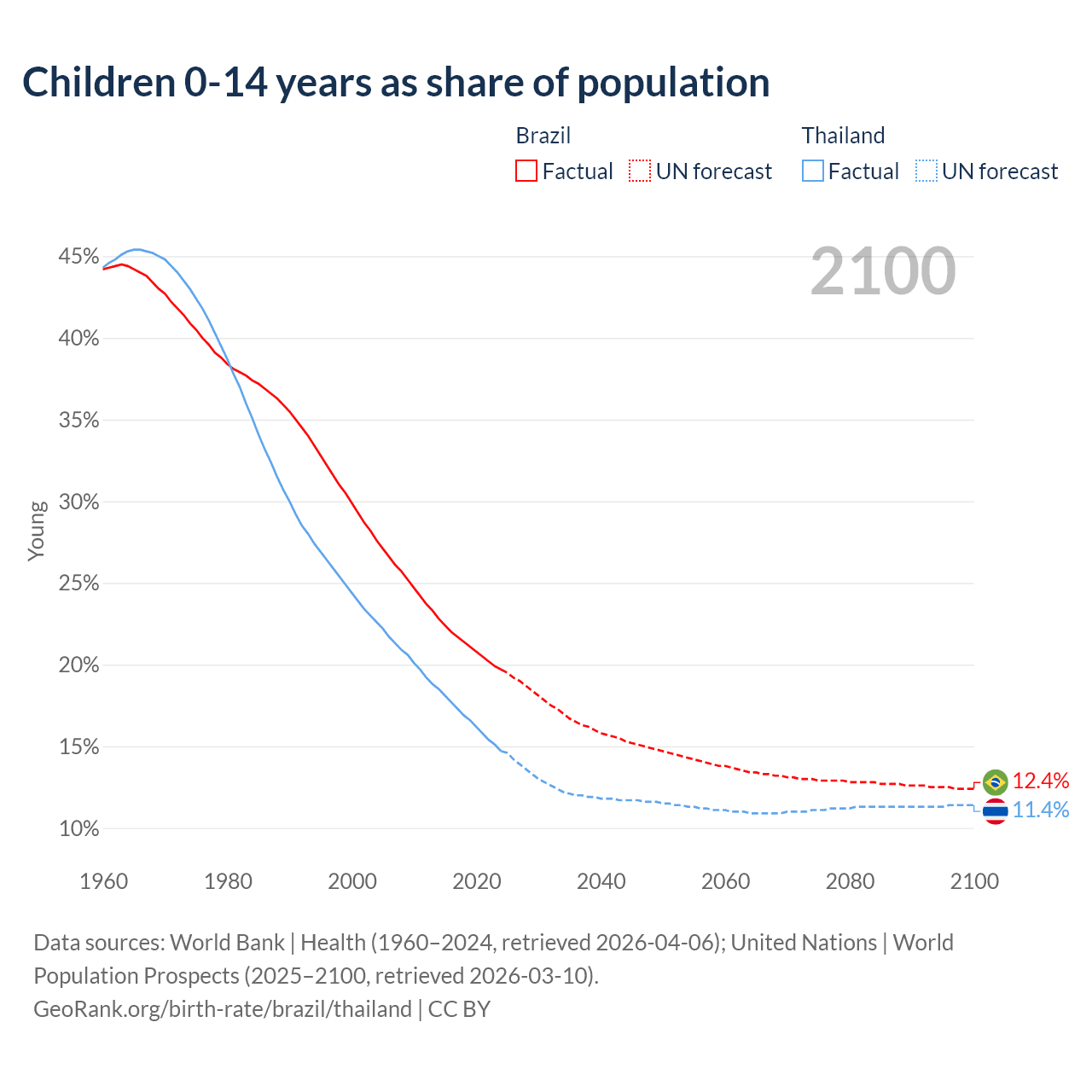 According to the latest available data on birth rates, the fertility rate in Brazil was 1.62 children per woman in 2023, compared to 1.21 in Thailand in 2023. The replacement level is considered to be 2.1 children per woman.