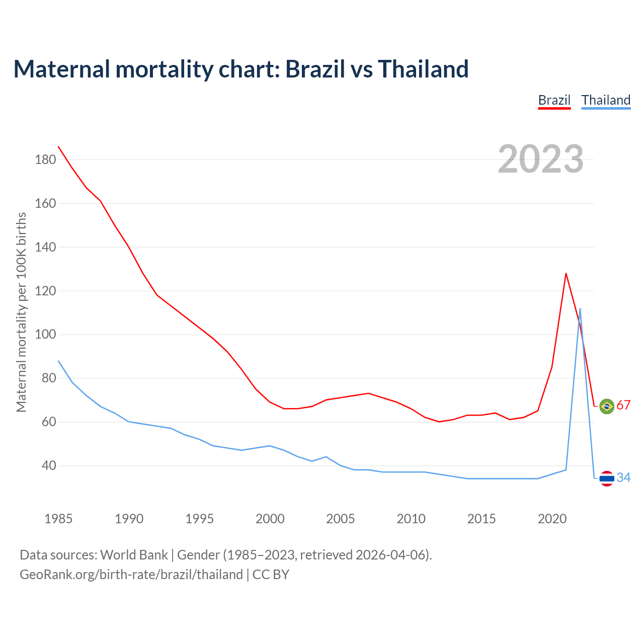 The maternal mortality rate, which is the probability of dying during childbirth or within 42 days of pregnancy termination, is 67 deaths per 100,000 live births in Brazil, compared to 34 deaths in Thailand.
