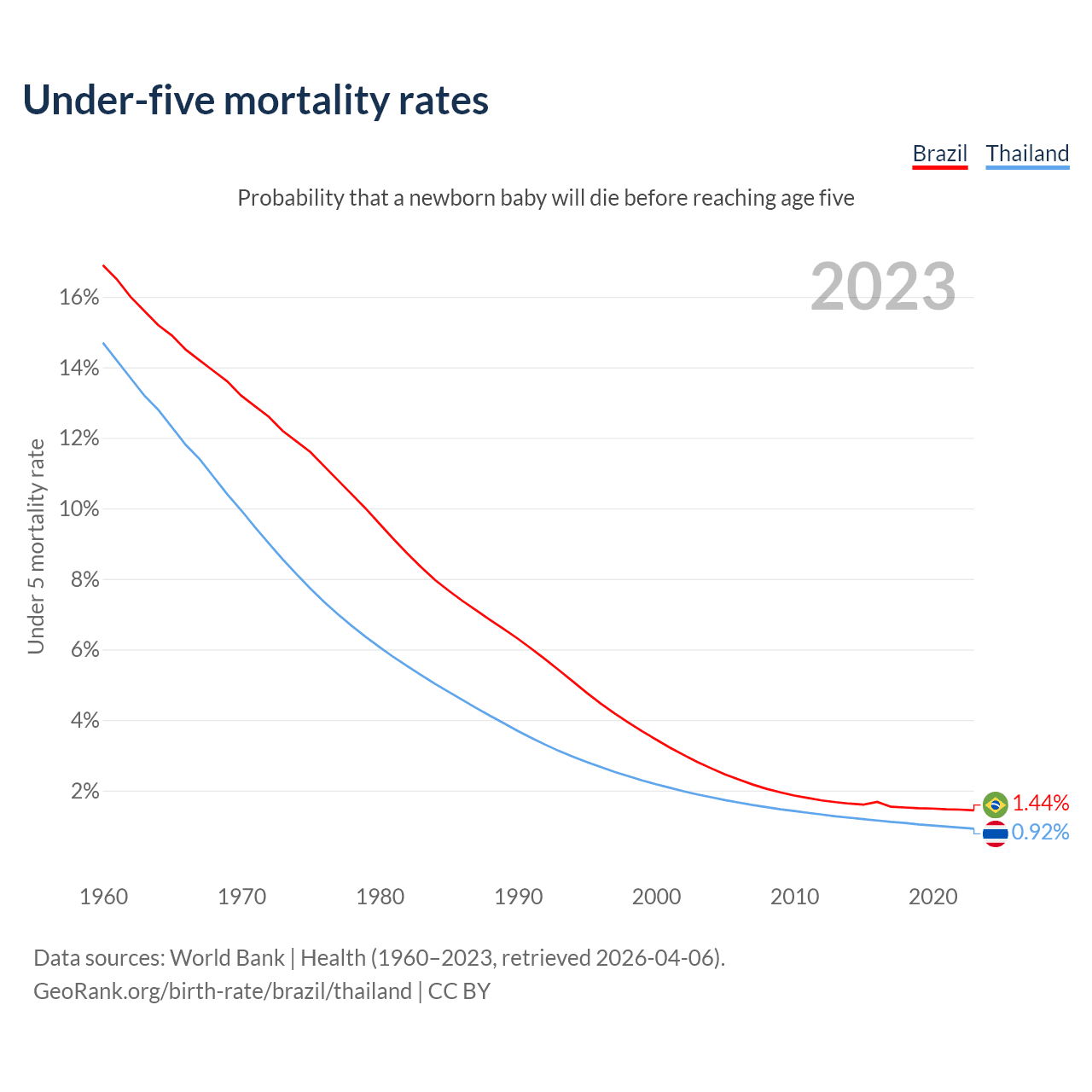 The chance that a newborn baby will die before reaching age five is 1.44% in Brazil and 0.92% in Thailand. Above is a chart with historical data on under-five mortality rates.