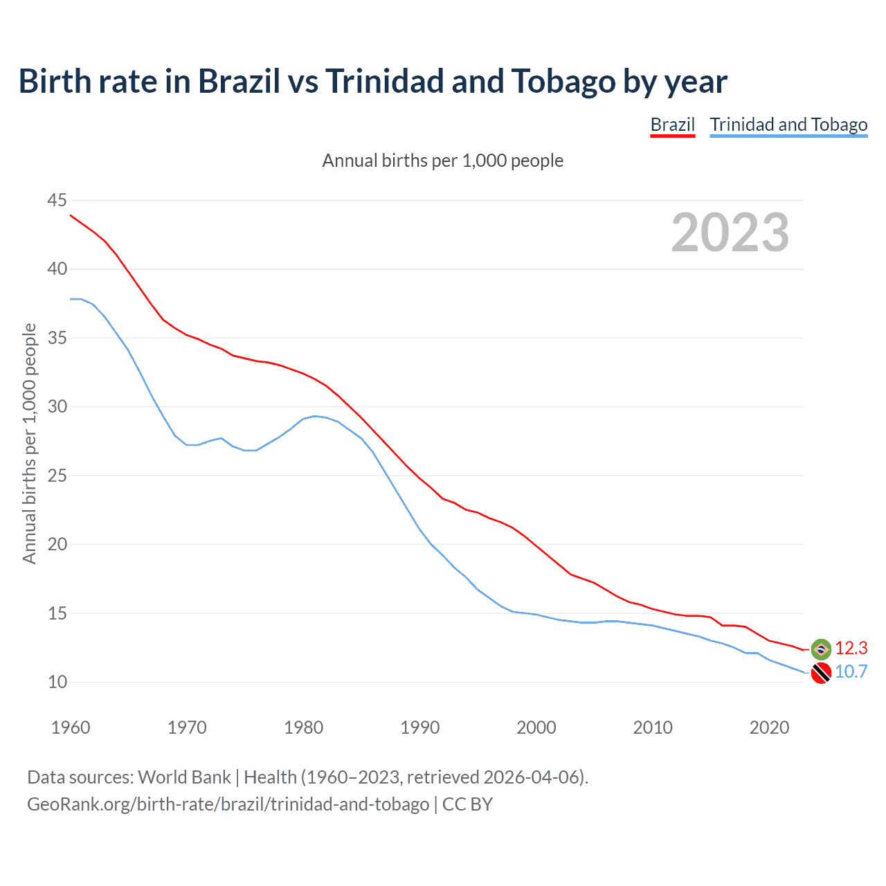 Brazil has an annual birth rate of 12.3 births per 1,000 people, compared to 10.7 for Trinidad and Tobago. The average number of children a woman is expected to have during her lifetime — the fertility rate, is 1.62 in Brazil and 1.53 in Trinidad and Tobago — 5.37% difference.