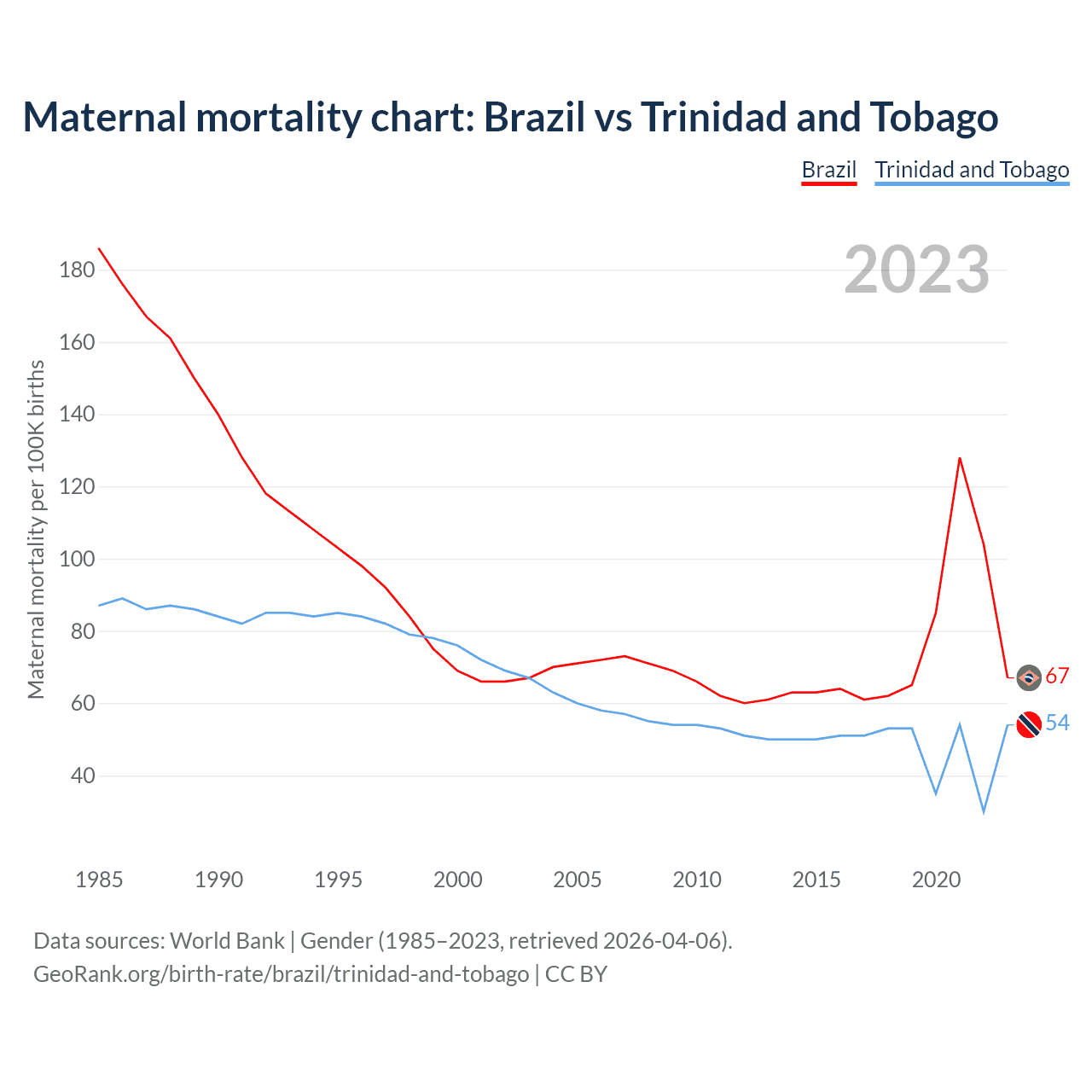 The maternal mortality rate, which is the probability of dying during childbirth or within 42 days of pregnancy termination, is 67 deaths per 100,000 live births in Brazil, compared to 54 deaths in Trinidad and Tobago.