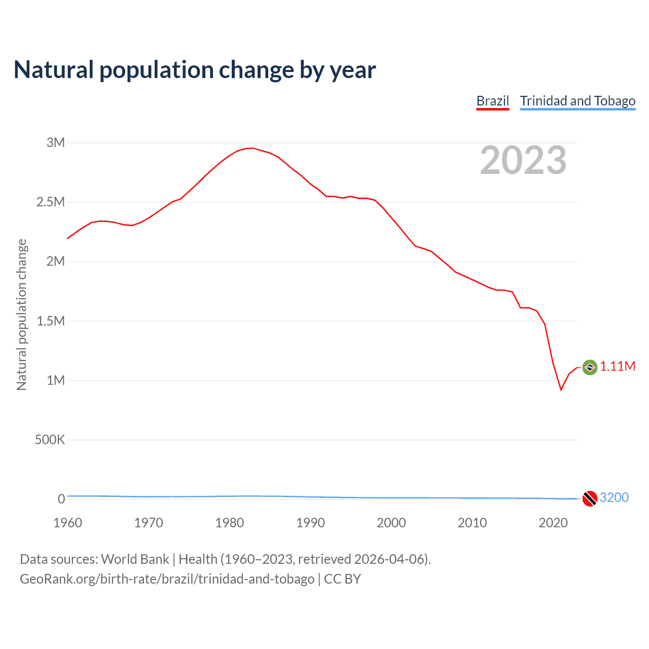 According to the latest available data on birth rates, the fertility rate in Brazil was 1.62 children per woman in 2023, compared to 1.53 in Trinidad and Tobago in 2023. The replacement level is considered to be 2.1 children per woman.