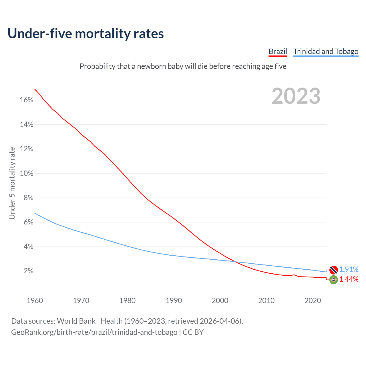 The chance that a newborn baby will die before reaching age five is 1.44% in Brazil and 1.91% in Trinidad and Tobago. Above is a chart with historical data on under-five mortality rates.
