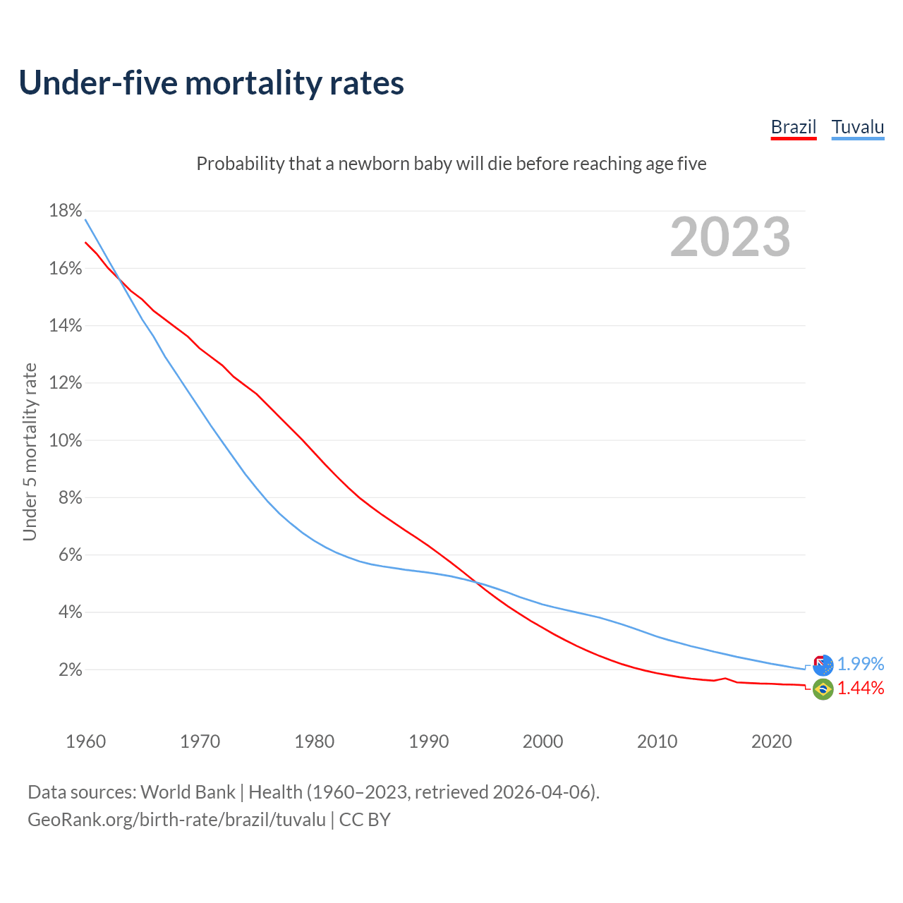 The chance that a newborn baby will die before reaching age five is 1.44% in Brazil and 1.99% in Tuvalu. Above is a chart with historical data on under-five mortality rates.