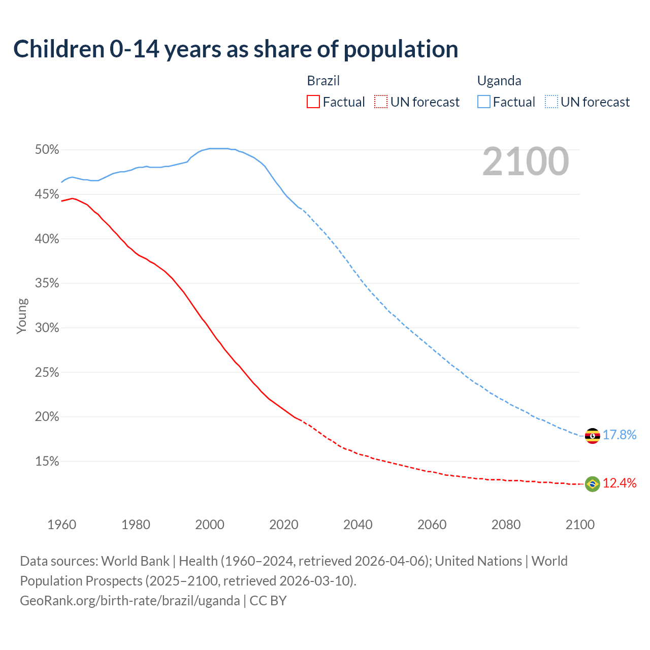 According to the latest available data on birth rates, the fertility rate in Brazil was 1.62 children per woman in 2023, compared to 4.28 in Uganda in 2023. The replacement level is considered to be 2.1 children per woman.