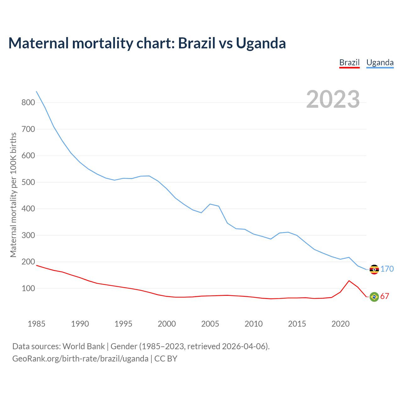 The maternal mortality rate, which is the probability of dying during childbirth or within 42 days of pregnancy termination, is 67 deaths per 100,000 live births in Brazil, compared to 170 deaths in Uganda.