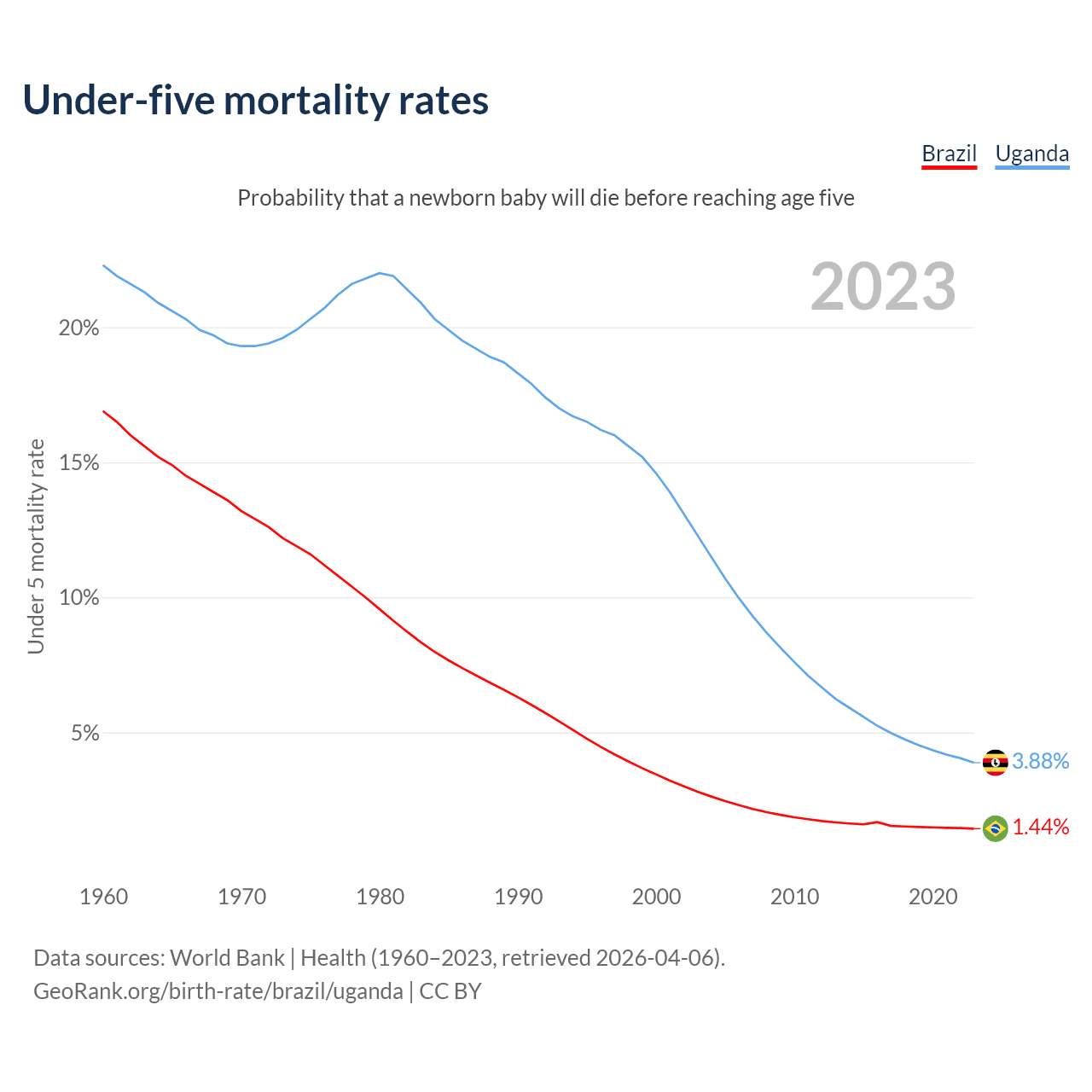 The chance that a newborn baby will die before reaching age five is 1.44% in Brazil and 3.88% in Uganda. Above is a chart with historical data on under-five mortality rates.