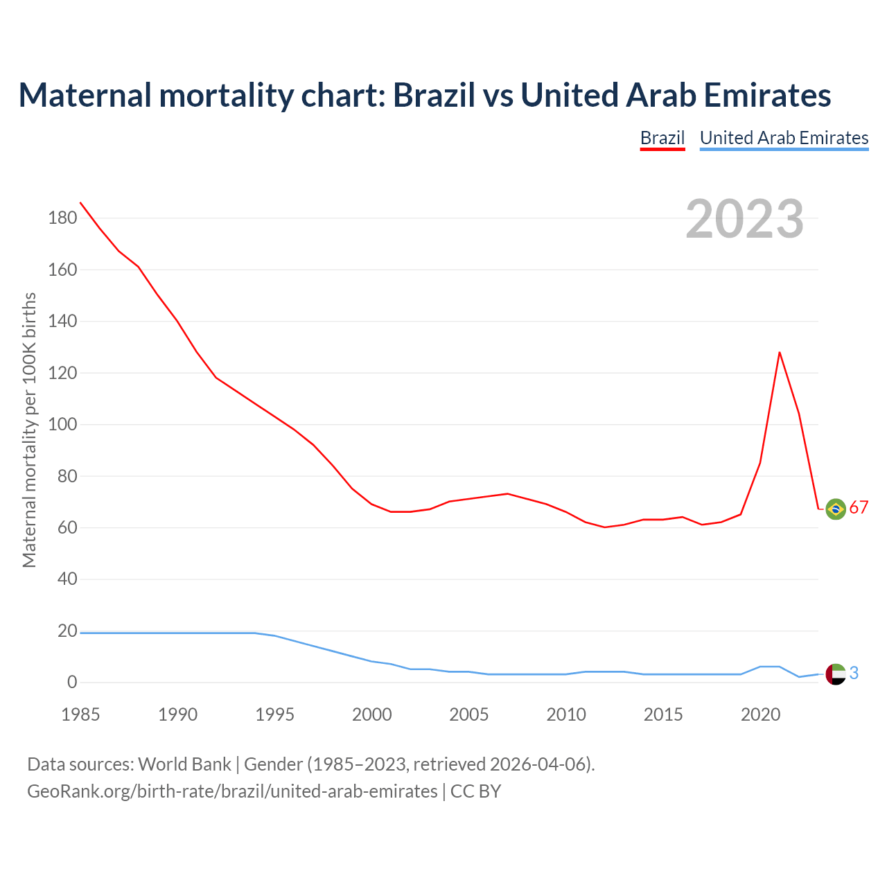 The maternal mortality rate, which is the probability of dying during childbirth or within 42 days of pregnancy termination, is 67 deaths per 100,000 live births in Brazil, compared to 3 deaths in the United Arab Emirates.