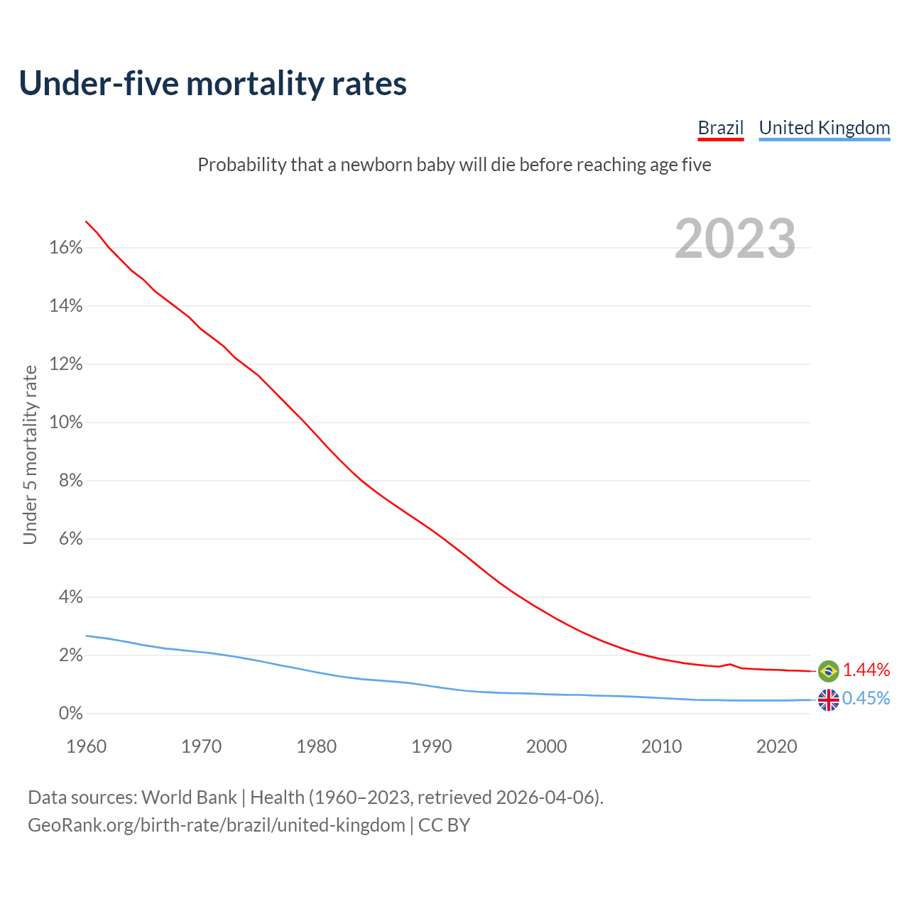 The chance that a newborn baby will die before reaching age five is 1.44% in Brazil and 0.45% in the United Kingdom. Above is a chart with historical data on under-five mortality rates.