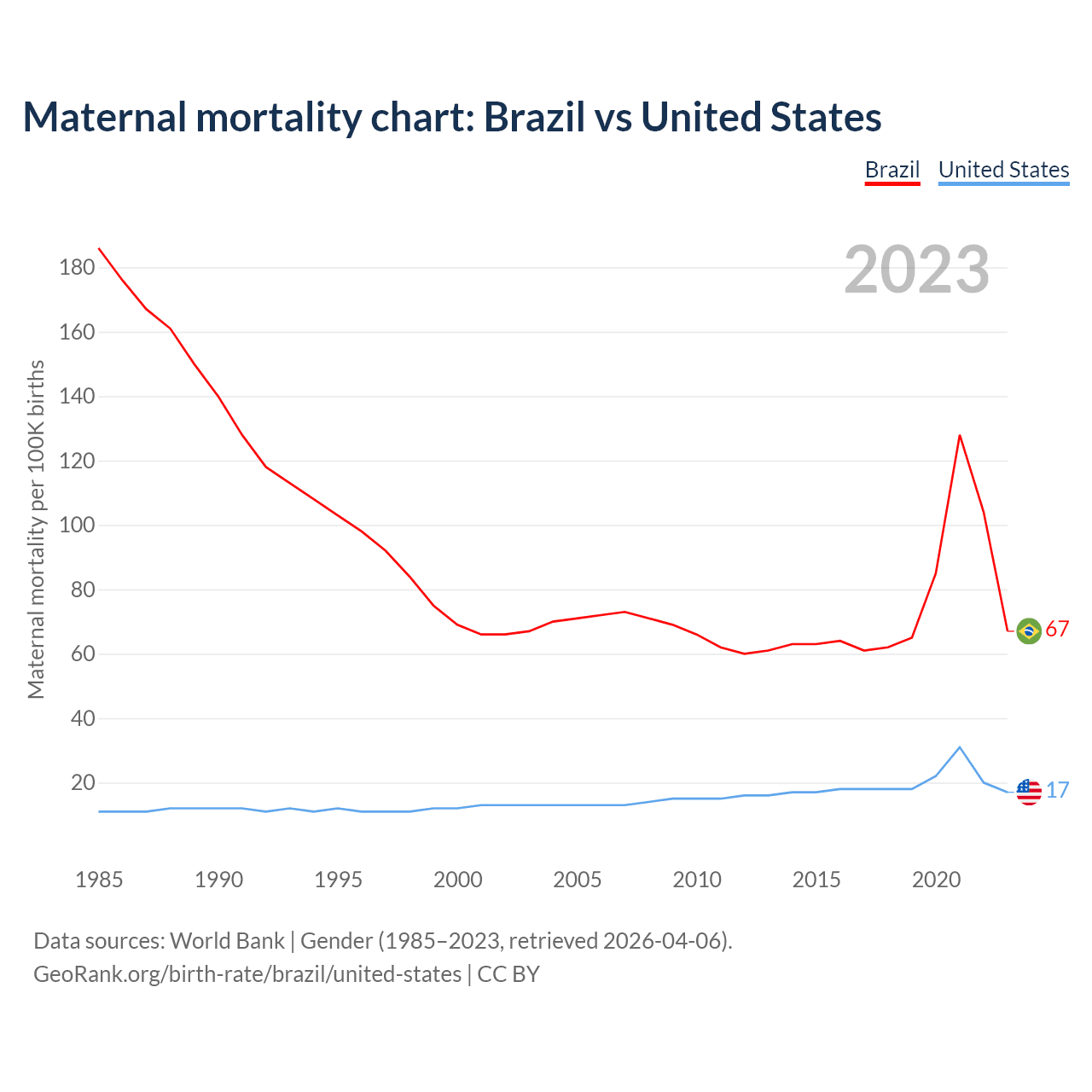 The maternal mortality rate, which is the probability of dying during childbirth or within 42 days of pregnancy termination, is 67 deaths per 100,000 live births in Brazil, compared to 17 deaths in the United States.