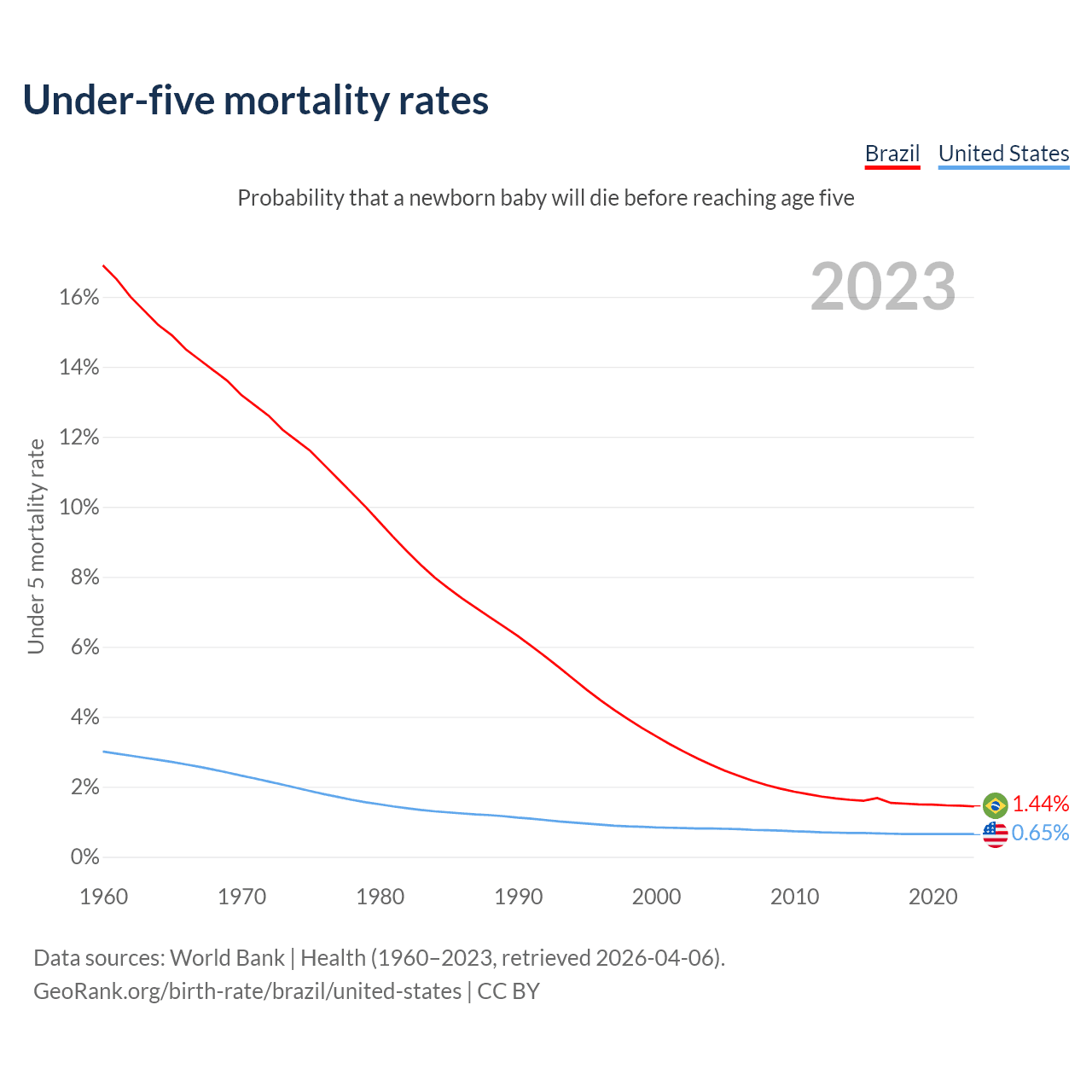 The chance that a newborn baby will die before reaching age five is 1.44% in Brazil and 0.65% in the United States. Above is a chart with historical data on under-five mortality rates.