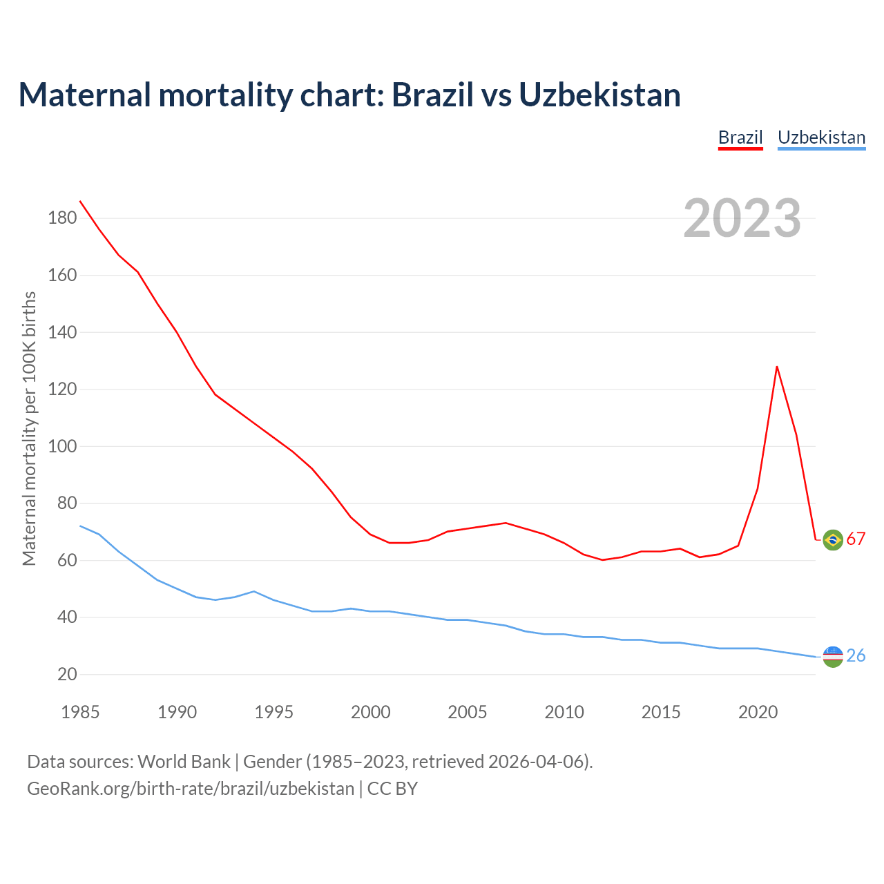 The maternal mortality rate, which is the probability of dying during childbirth or within 42 days of pregnancy termination, is 67 deaths per 100,000 live births in Brazil, compared to 26 deaths in Uzbekistan.