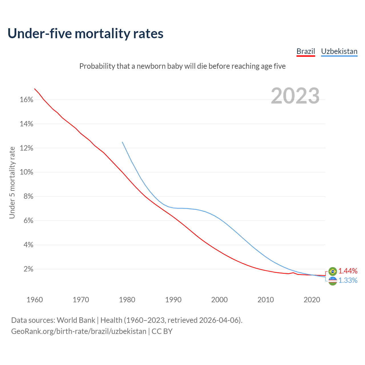 The chance that a newborn baby will die before reaching age five is 1.44% in Brazil and 1.33% in Uzbekistan. Above is a chart with historical data on under-five mortality rates.