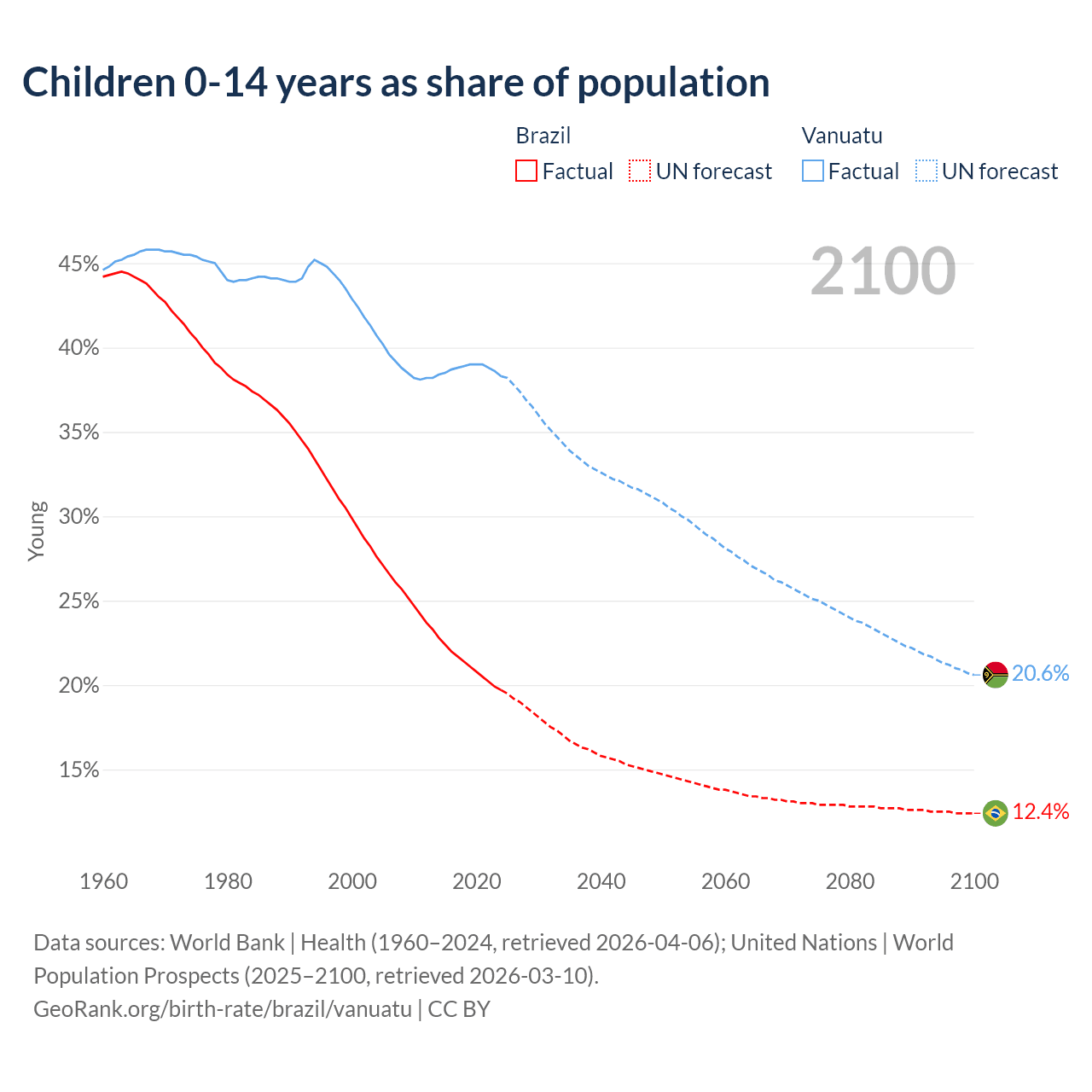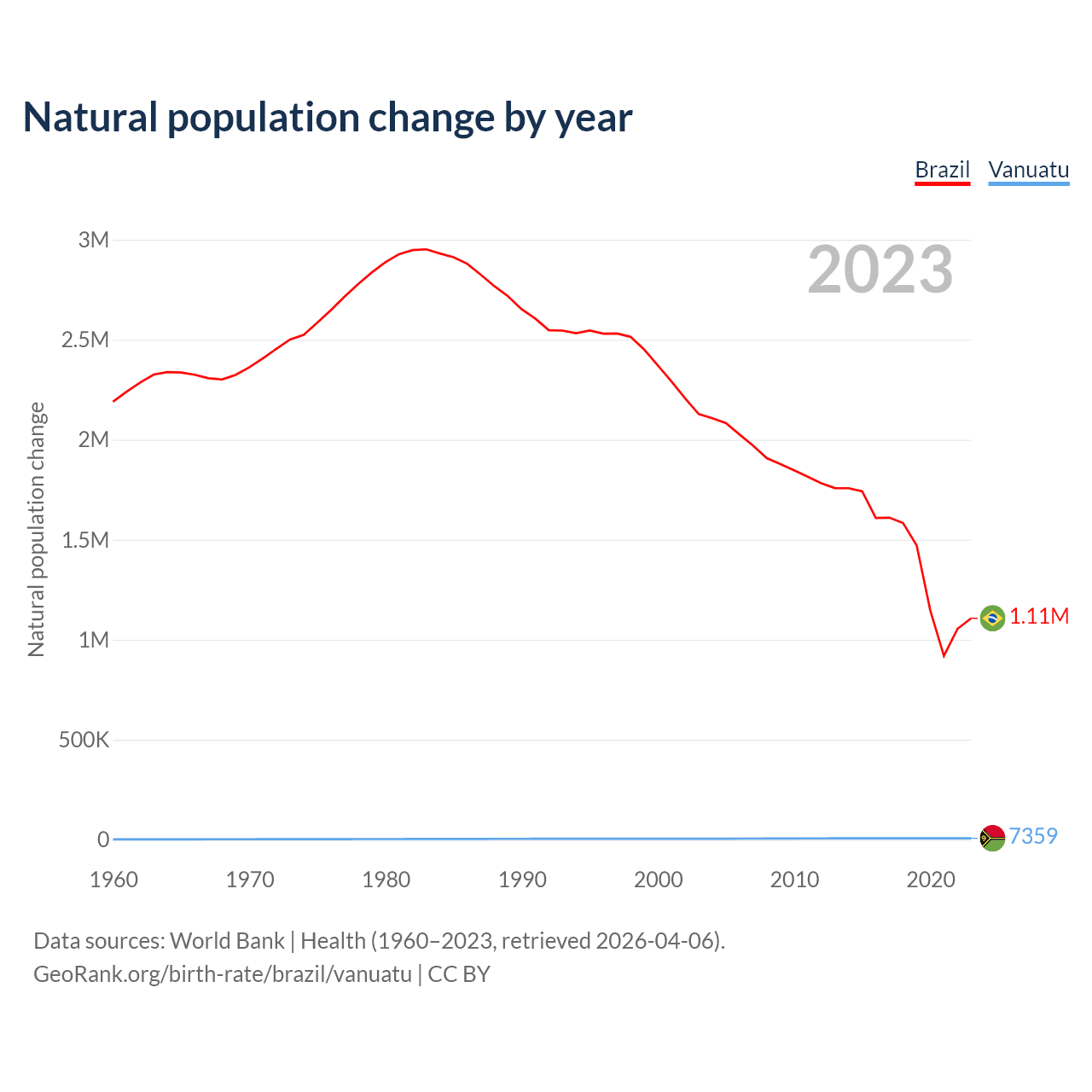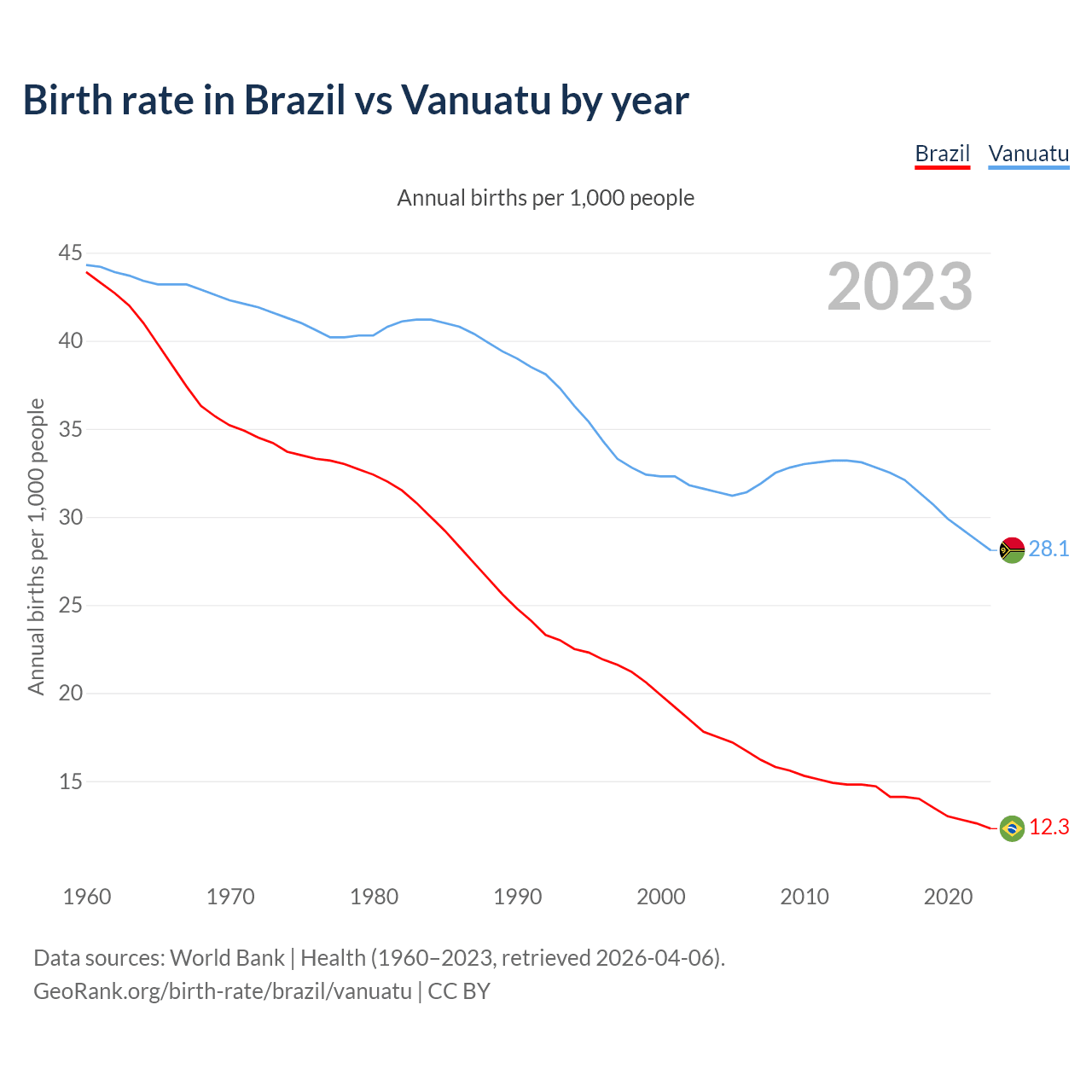 Brazil has an annual birth rate of 12.3 births per 1,000 people, compared to 28.1 for Vanuatu. The average number of children a woman is expected to have during her lifetime — the fertility rate, is 1.62 in Brazil and 3.6 in Vanuatu — 122.1% difference.