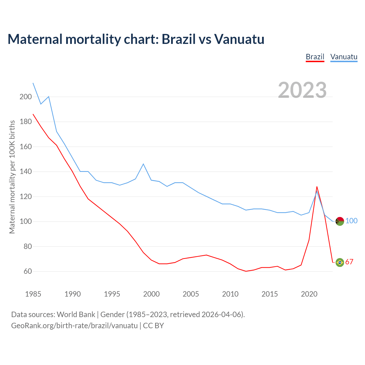 The maternal mortality rate, which is the probability of dying during childbirth or within 42 days of pregnancy termination, is 67 deaths per 100,000 live births in Brazil, compared to 100 deaths in Vanuatu.