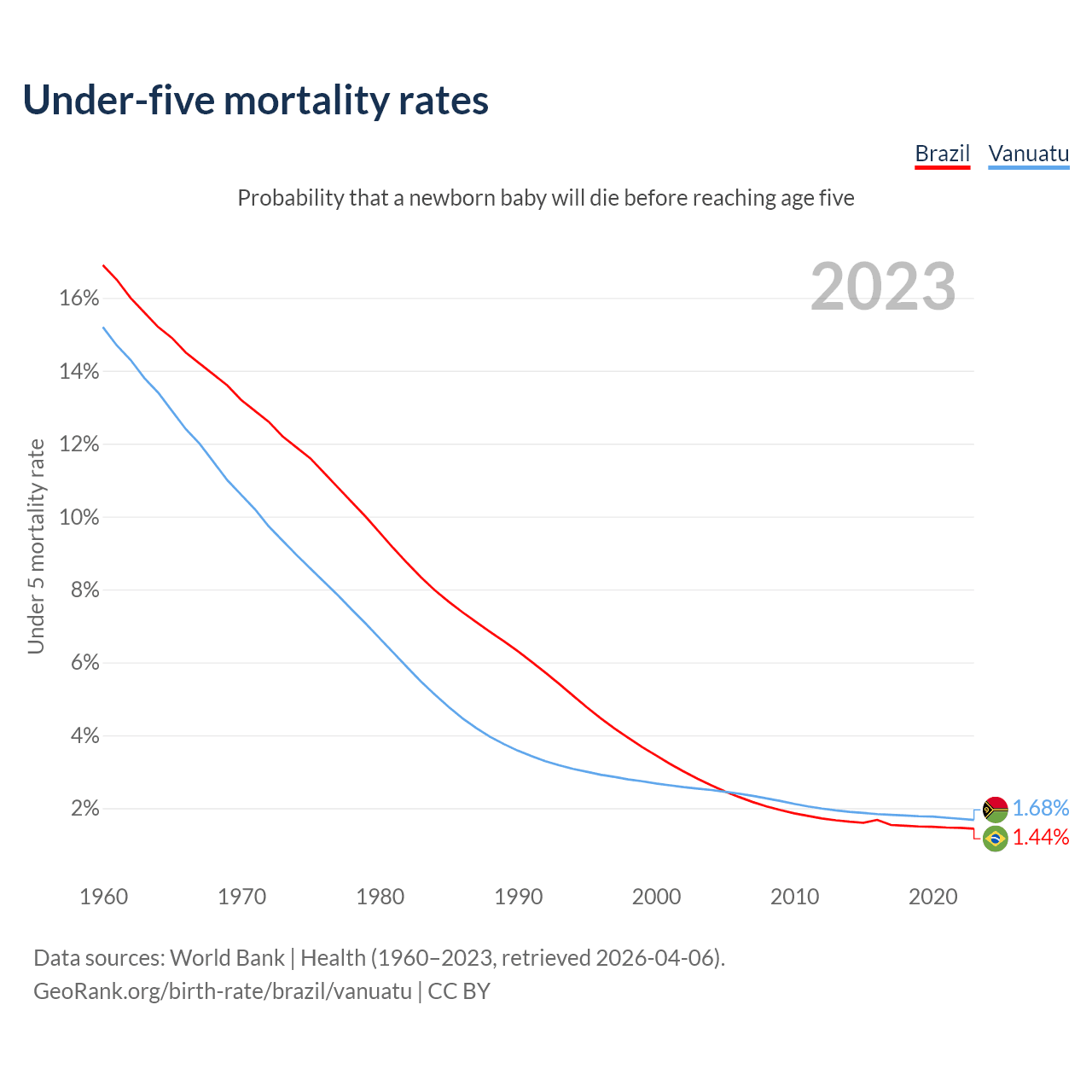 The chance that a newborn baby will die before reaching age five is 1.44% in Brazil and 1.68% in Vanuatu. Above is a chart with historical data on under-five mortality rates.