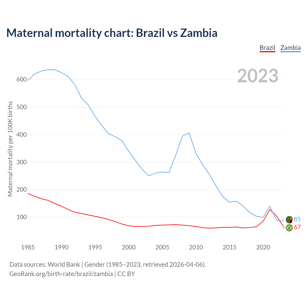 The maternal mortality rate, which is the probability of dying during childbirth or within 42 days of pregnancy termination, is 67 deaths per 100,000 live births in Brazil, compared to 85 deaths in Zambia.