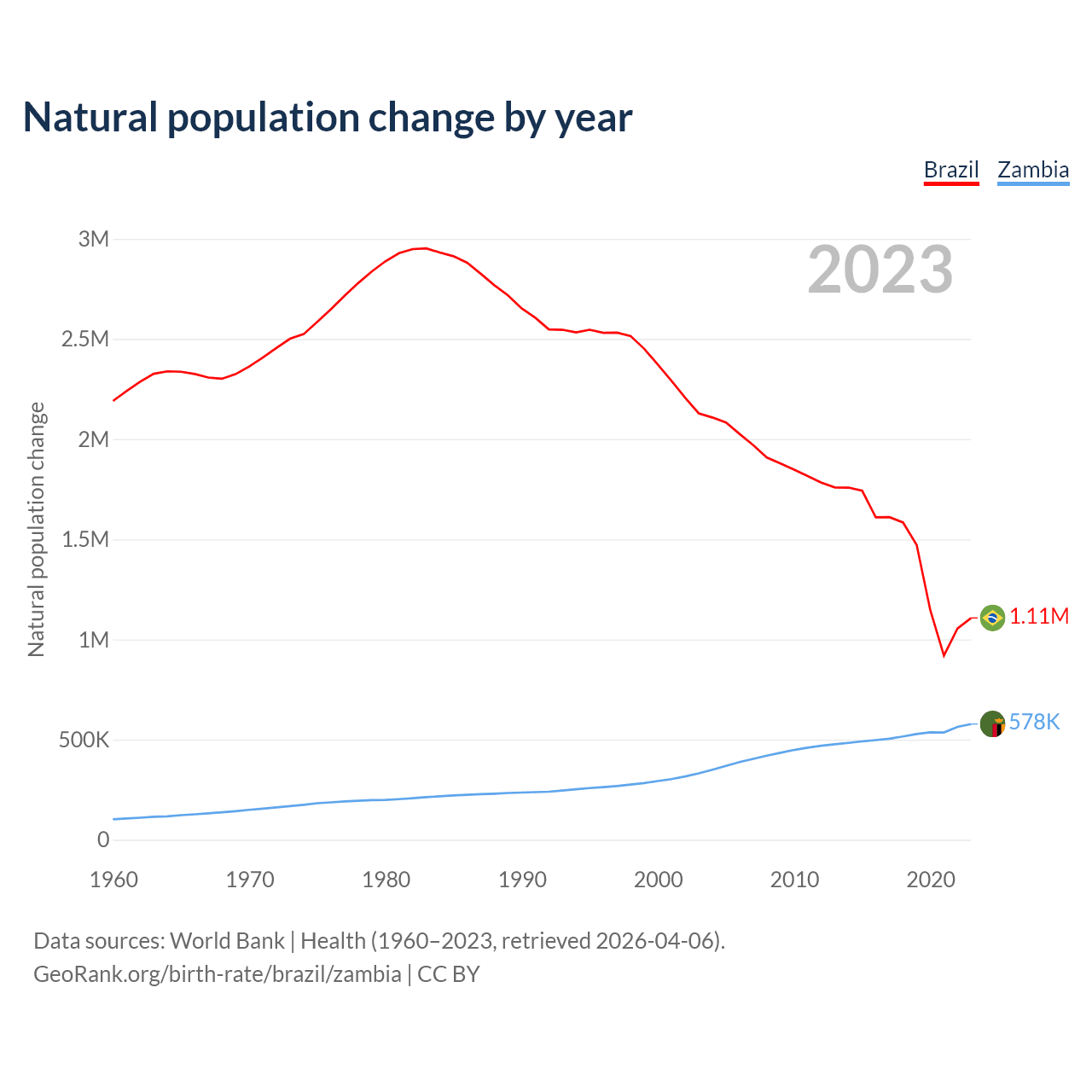 1960 vs 2023, the fertility rate has decreased by 73.2% in Brazil and by 41% in Zambia — in 1960, it was 6.05 and 6.95, respectively.