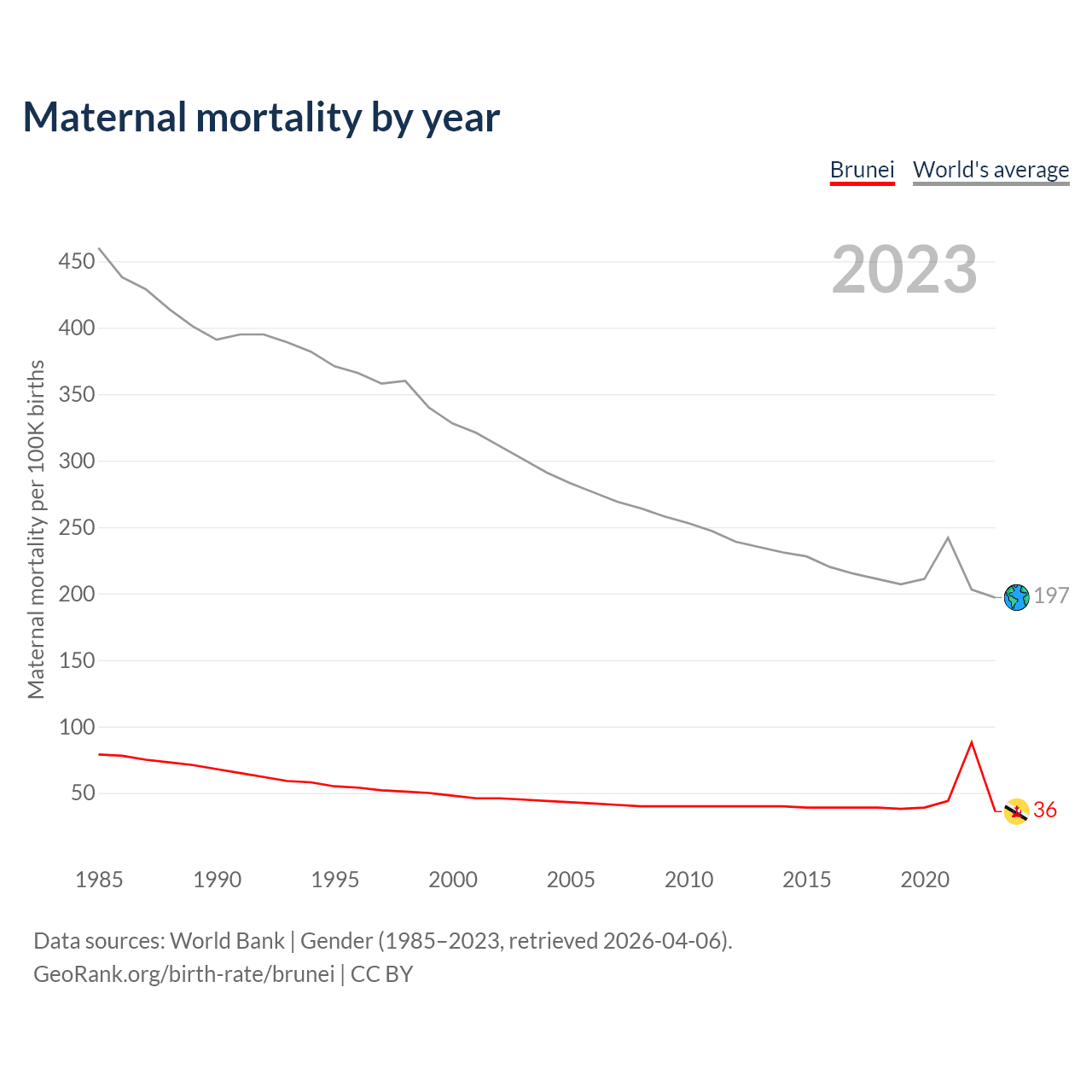 The maternal mortality rate in Brunei was 36 deaths per 100,000 live births in 2023 — a 0.04% chance of dying during childbirth or within 42 days of pregnancy termination. This is a 25% decrease compared to the year 2000.