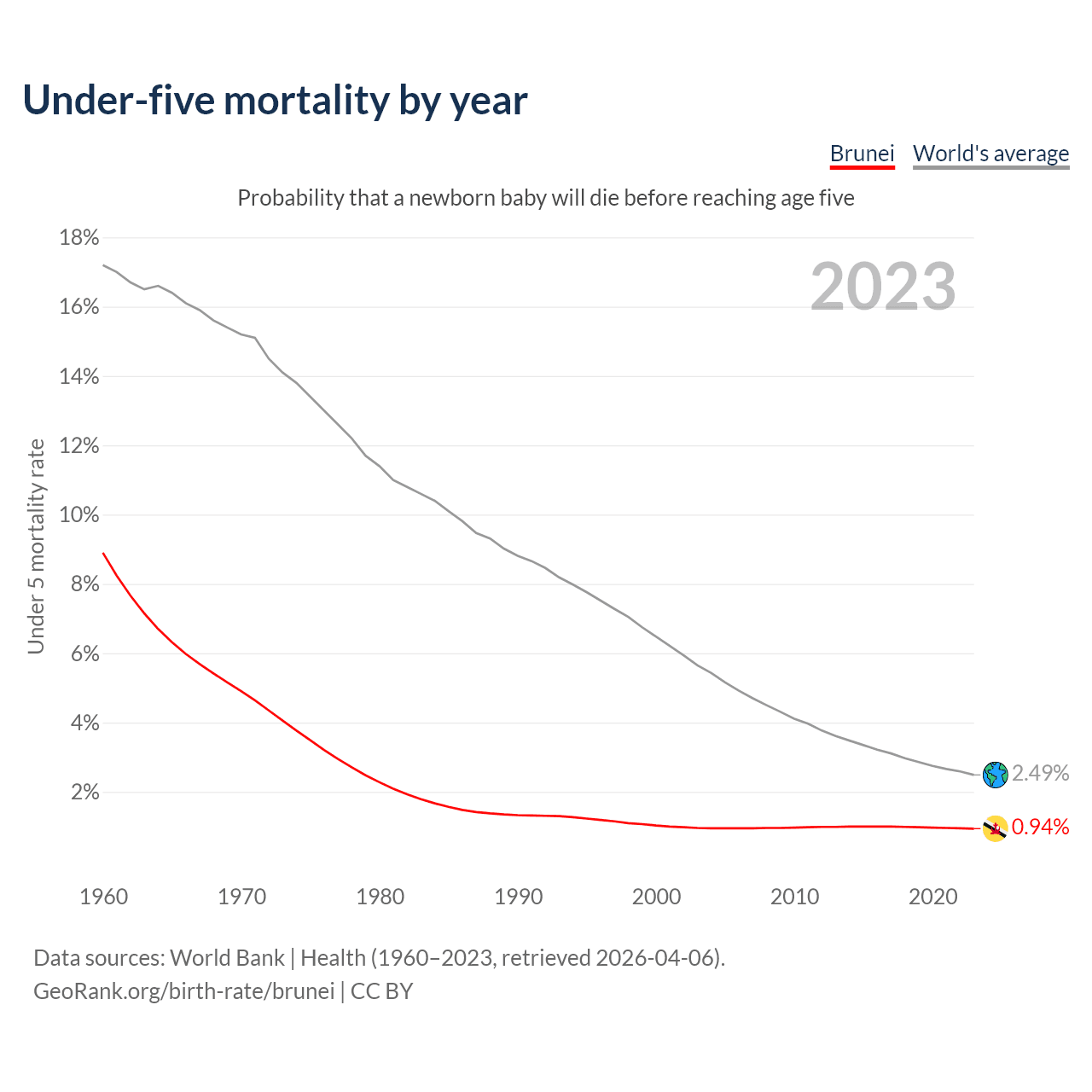 The under-5 mortality rate in Brunei was 9.4 deaths per 1,000 live births in 2023 — a 0.94% chance that a newborn baby will die before reaching age five. This is down from 10.3 deaths per 1,000 live births in 2000.