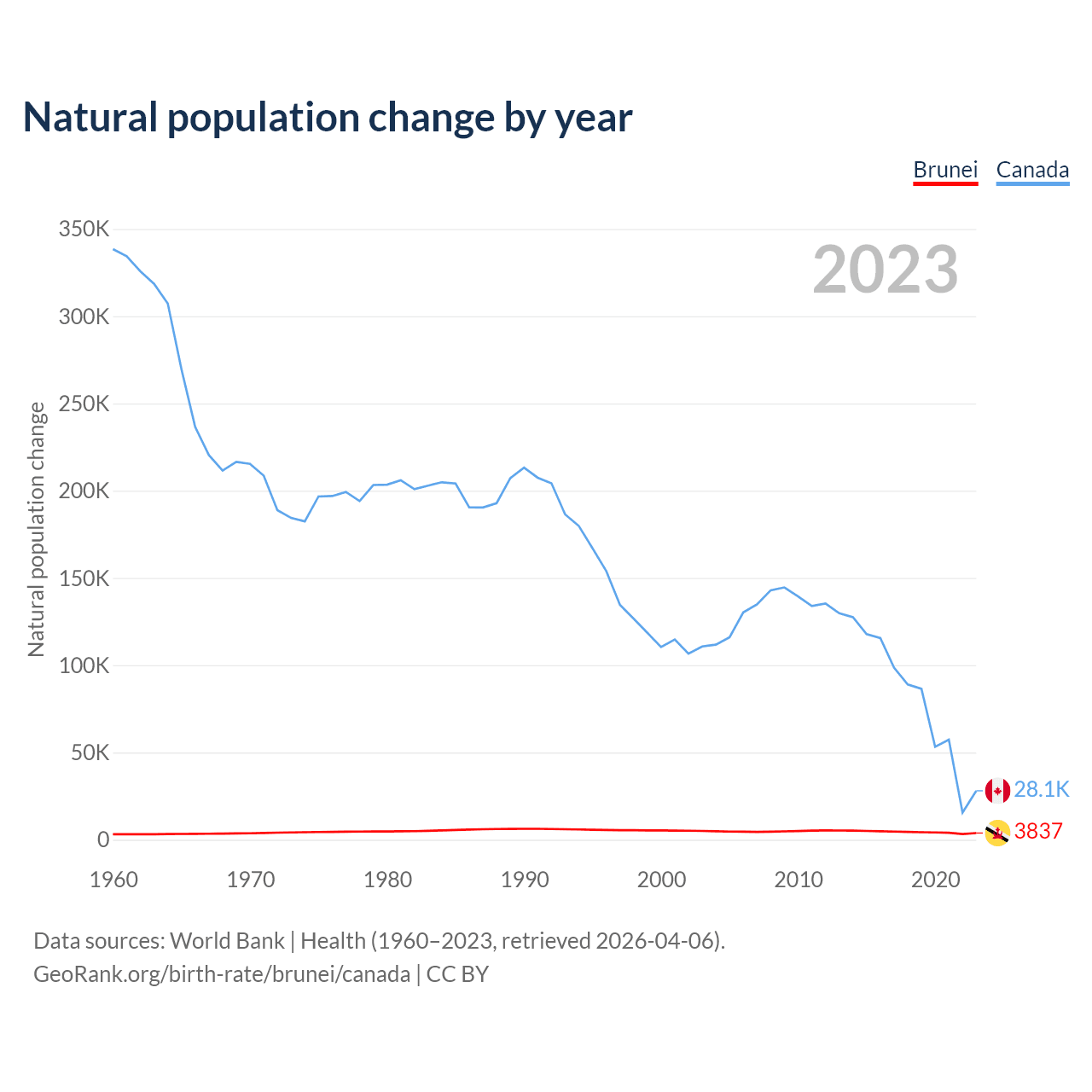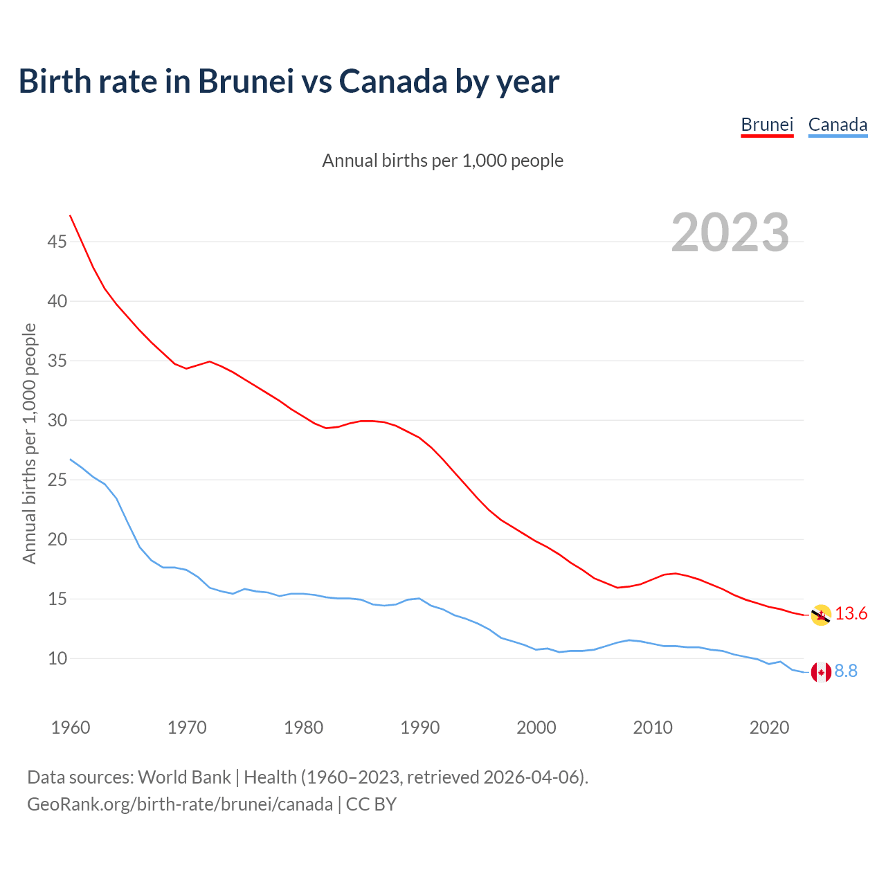 Brunei has an annual birth rate of 13.6 births per 1,000 people, compared to 8.8 for Canada. The average number of children a woman is expected to have during her lifetime — the fertility rate, is 1.75 in Brunei and 1.26 in Canada — 27.9% difference.