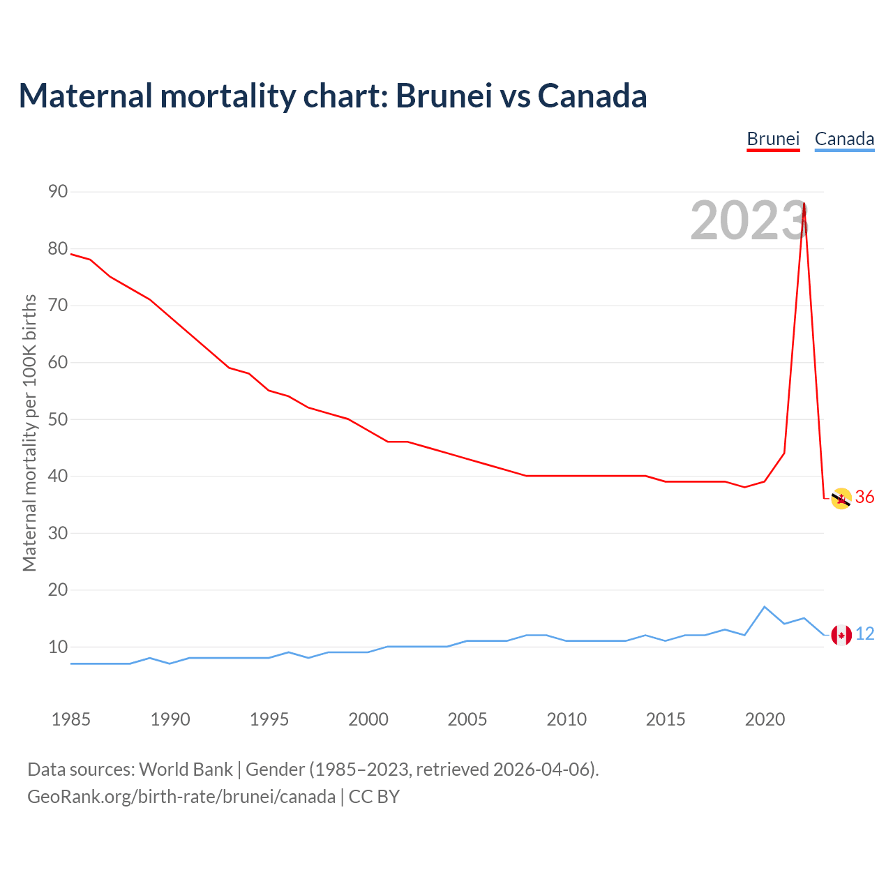 The maternal mortality rate, which is the probability of dying during childbirth or within 42 days of pregnancy termination, is 36 deaths per 100,000 live births in Brunei, compared to 12 deaths in Canada.