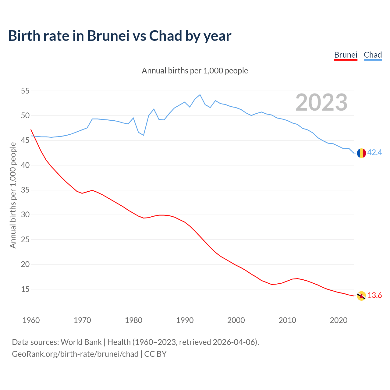 Brunei has an annual birth rate of 13.6 births per 1,000 people, compared to 42.4 for Chad. The average number of children a woman is expected to have during her lifetime — the fertility rate, is 1.75 in Brunei and 6.12 in Chad — 250.3% difference.