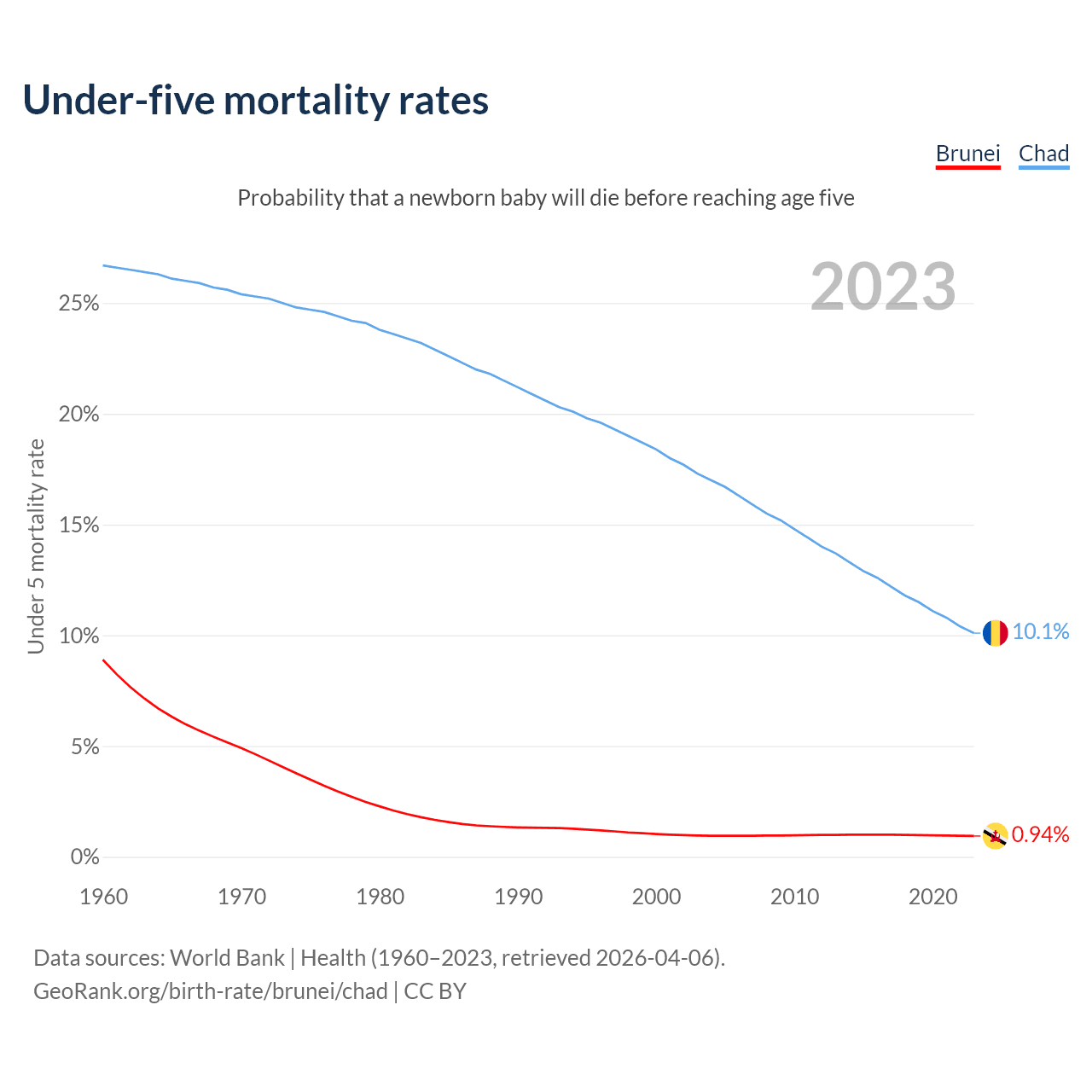 The chance that a newborn baby will die before reaching age five is 0.94% in Brunei and 10.1% in Chad. Above is a chart with historical data on under-five mortality rates.