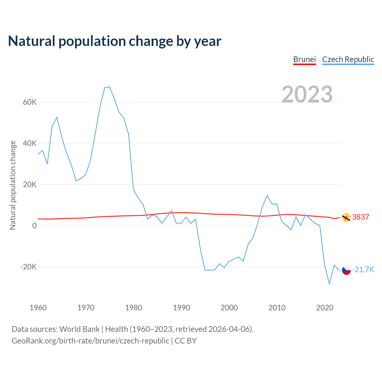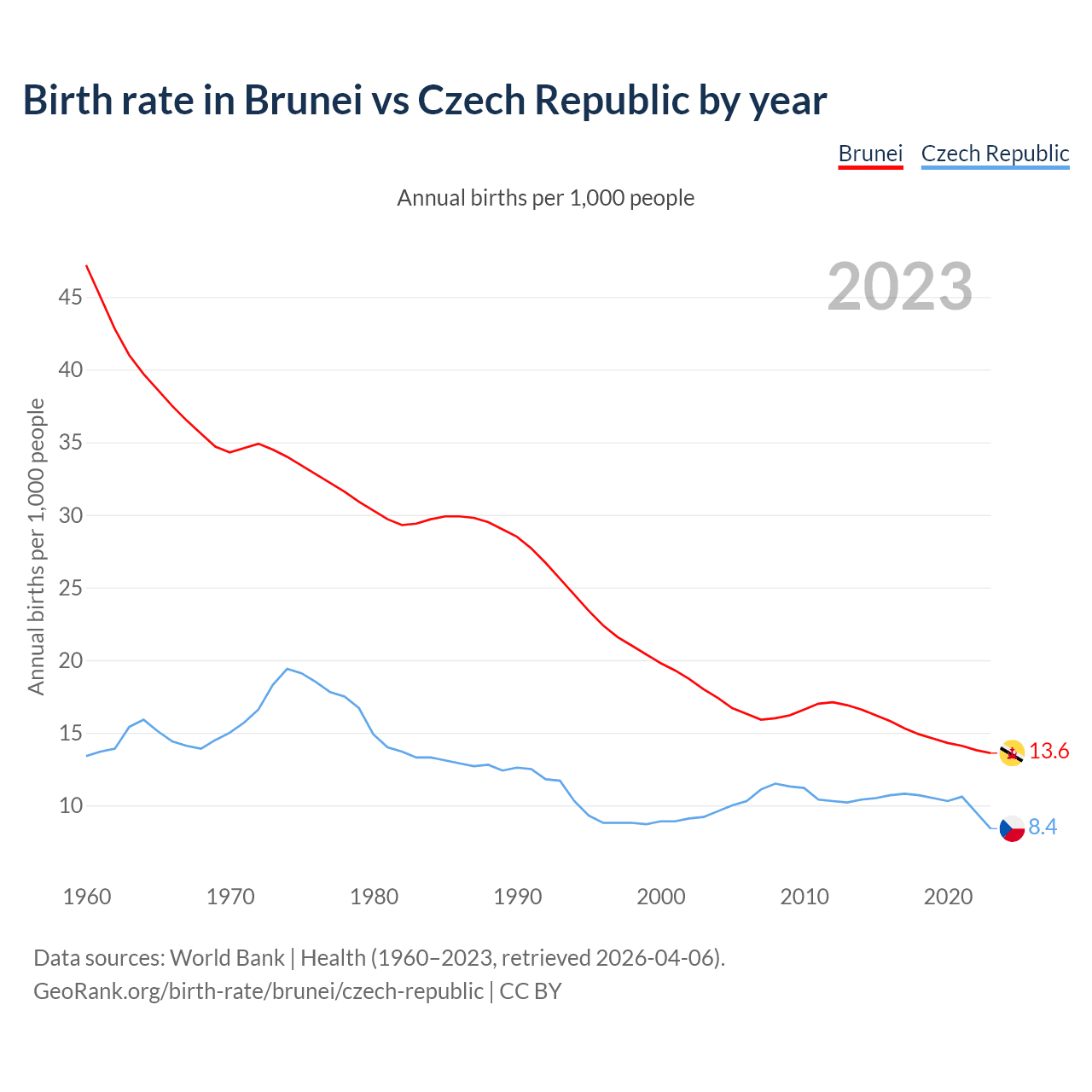 Brunei has an annual birth rate of 13.6 births per 1,000 people, compared to 8.4 for the Czech Republic. The average number of children a woman is expected to have during her lifetime — the fertility rate, is 1.75 in Brunei and 1.45 in the Czech Republic — 17% difference.