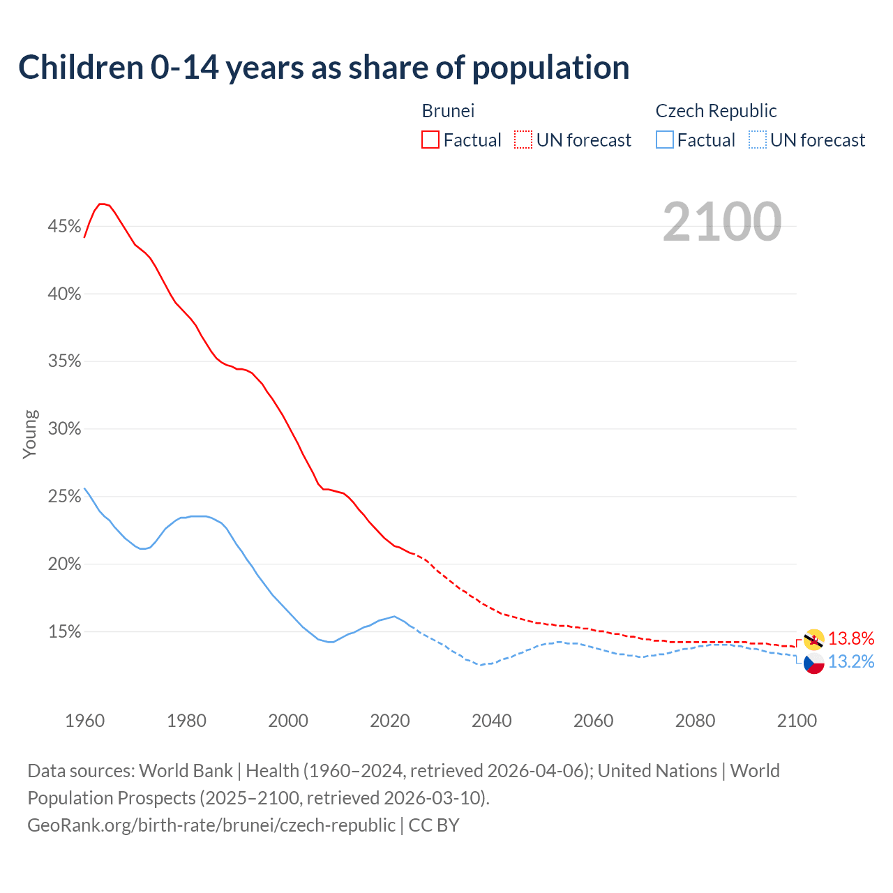 According to the latest available data on birth rates, the fertility rate in Brunei was 1.75 children per woman in 2023, compared to 1.45 in the Czech Republic in 2023. The replacement level is considered to be 2.1 children per woman.