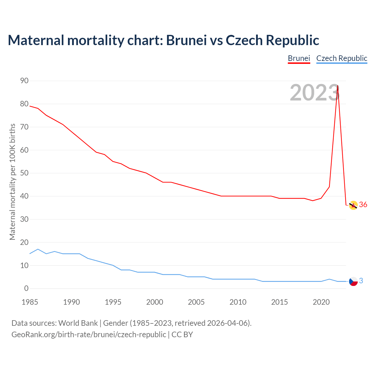 The maternal mortality rate, which is the probability of dying during childbirth or within 42 days of pregnancy termination, is 36 deaths per 100,000 live births in Brunei, compared to 3 deaths in the Czech Republic.
