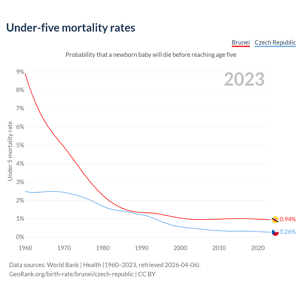 The chance that a newborn baby will die before reaching age five is 0.94% in Brunei and 0.26% in the Czech Republic. Above is a chart with historical data on under-five mortality rates.