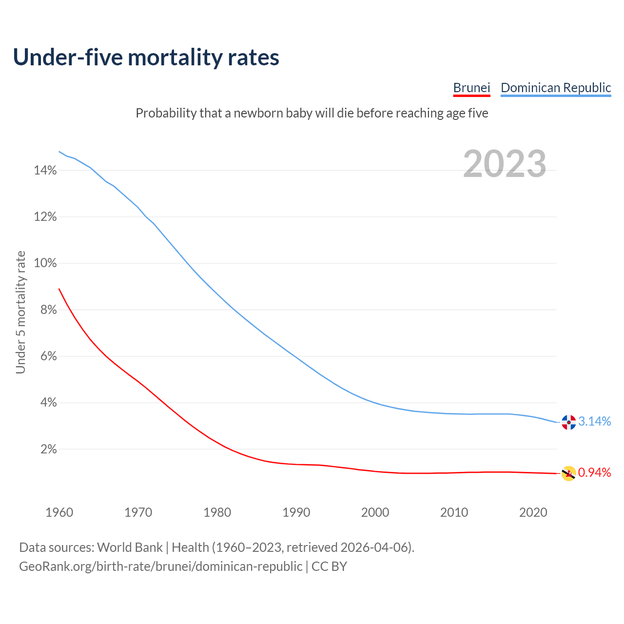 The chance that a newborn baby will die before reaching age five is 0.94% in Brunei and 3.14% in the Dominican Republic. Above is a chart with historical data on under-five mortality rates.