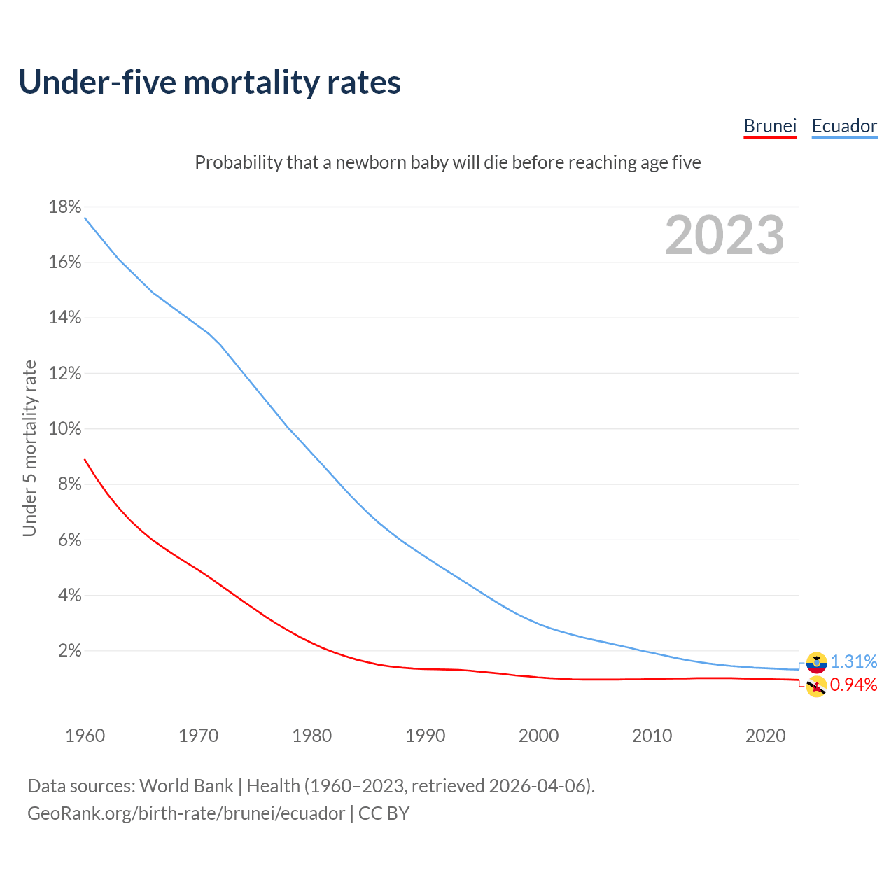 The chance that a newborn baby will die before reaching age five is 0.94% in Brunei and 1.31% in Ecuador. Above is a chart with historical data on under-five mortality rates.