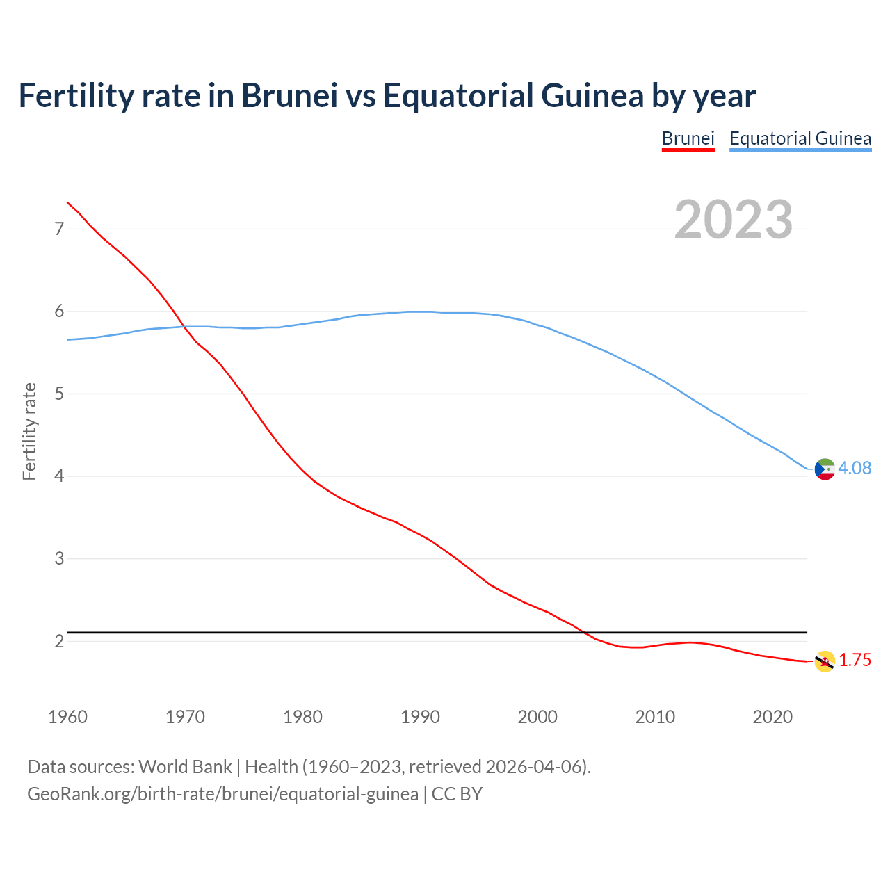 1960 vs 2023, the fertility rate has decreased by 76.1% in Brunei and by 27.8% in Equatorial Guinea — in 1960, it was 7.32 and 5.65, respectively.
