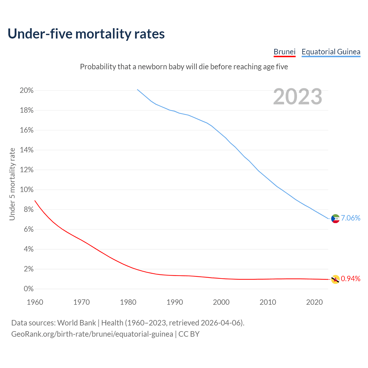 The chance that a newborn baby will die before reaching age five is 0.94% in Brunei and 7.06% in Equatorial Guinea. Above is a chart with historical data on under-five mortality rates.