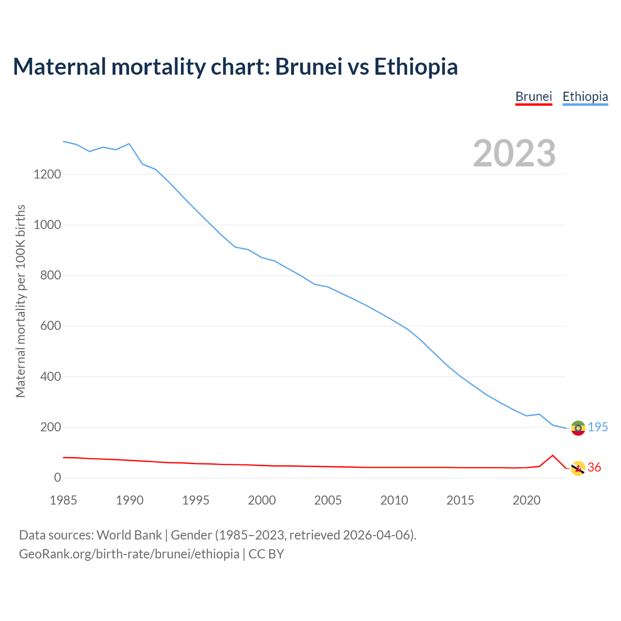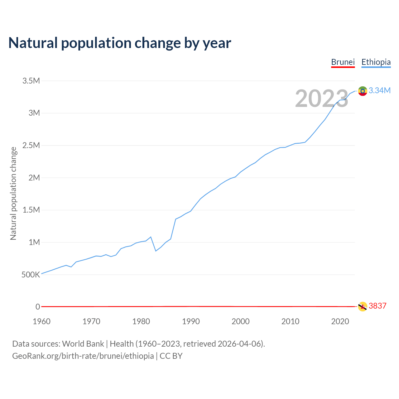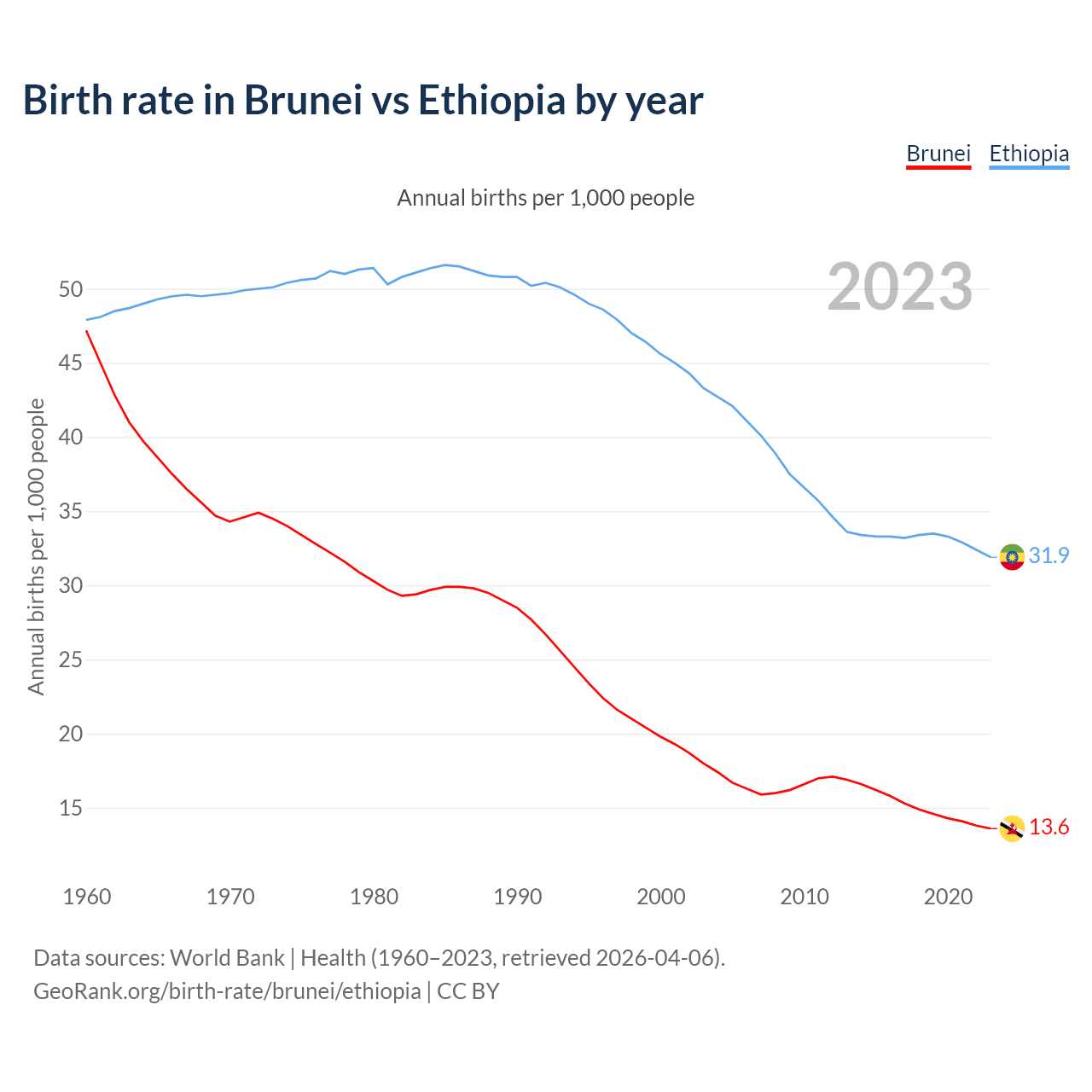 Brunei has an annual birth rate of 13.6 births per 1,000 people, compared to 31.9 for Ethiopia. The average number of children a woman is expected to have during her lifetime — the fertility rate, is 1.75 in Brunei and 3.99 in Ethiopia — 128.3% difference.