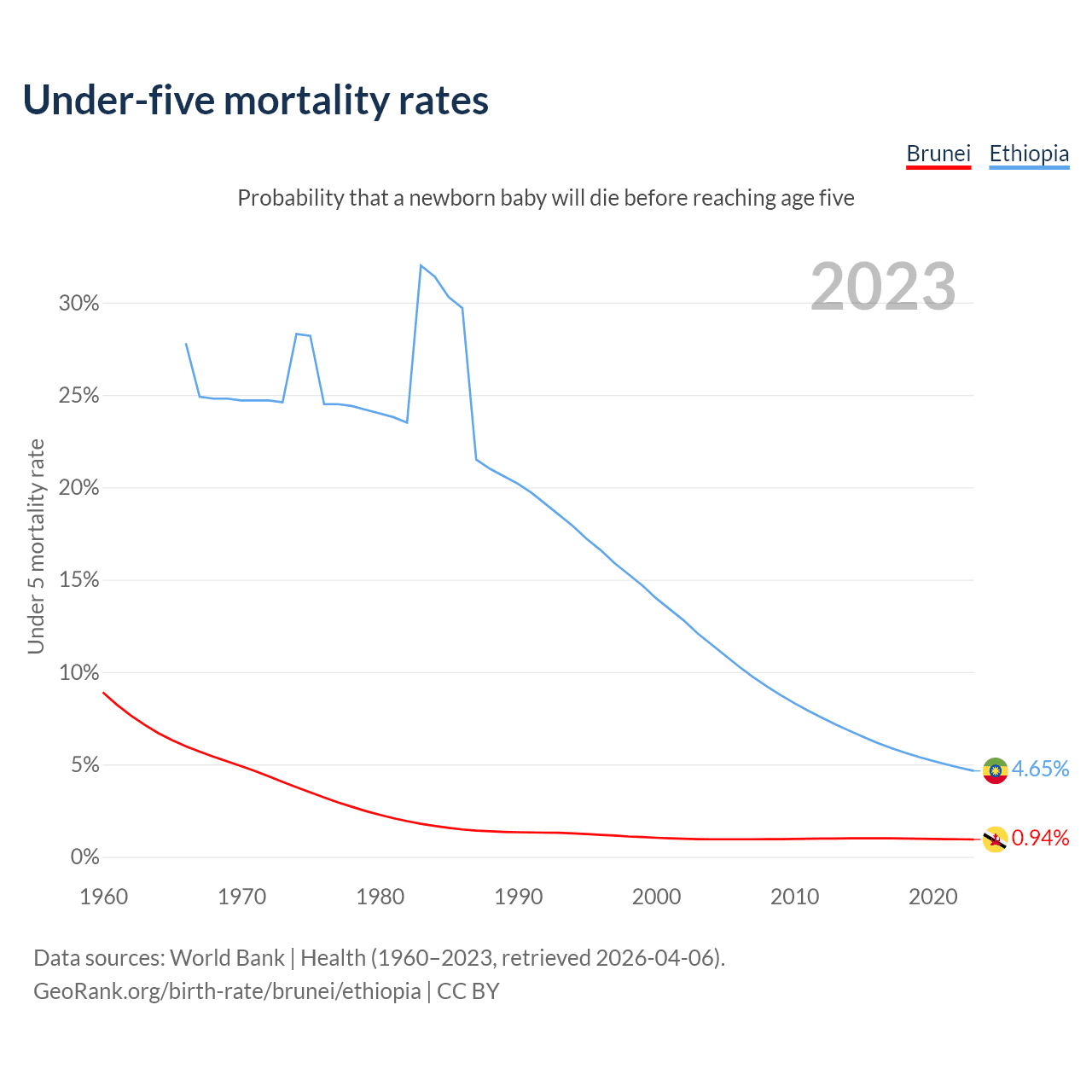 The chance that a newborn baby will die before reaching age five is 0.94% in Brunei and 4.65% in Ethiopia. Above is a chart with historical data on under-five mortality rates.