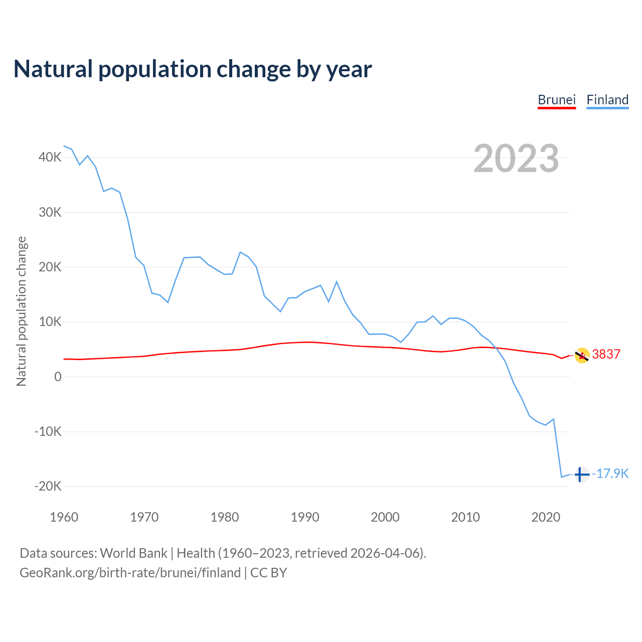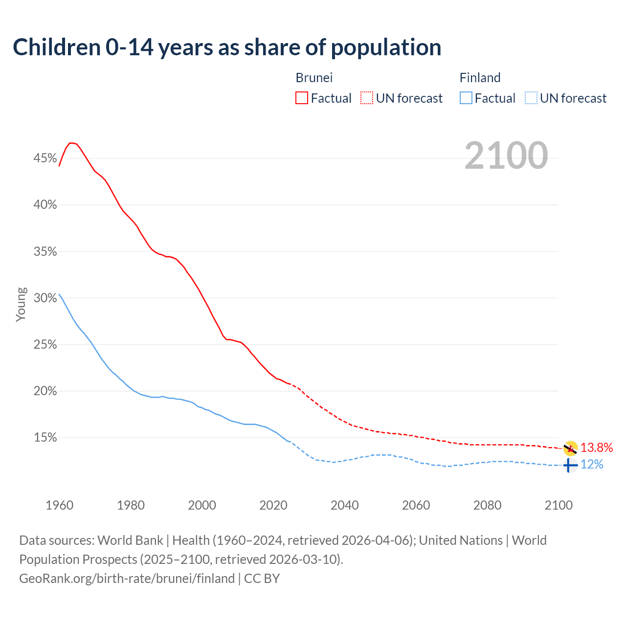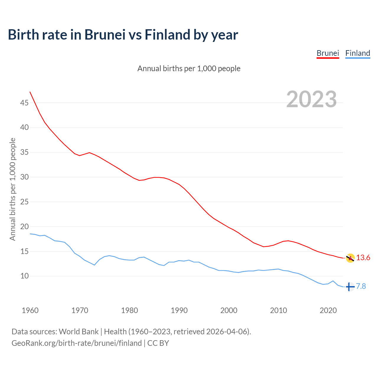 According to the latest available data on birth rates, the fertility rate in Brunei was 1.75 children per woman in 2023, compared to 1.26 in Finland in 2023. The replacement level is considered to be 2.1 children per woman.