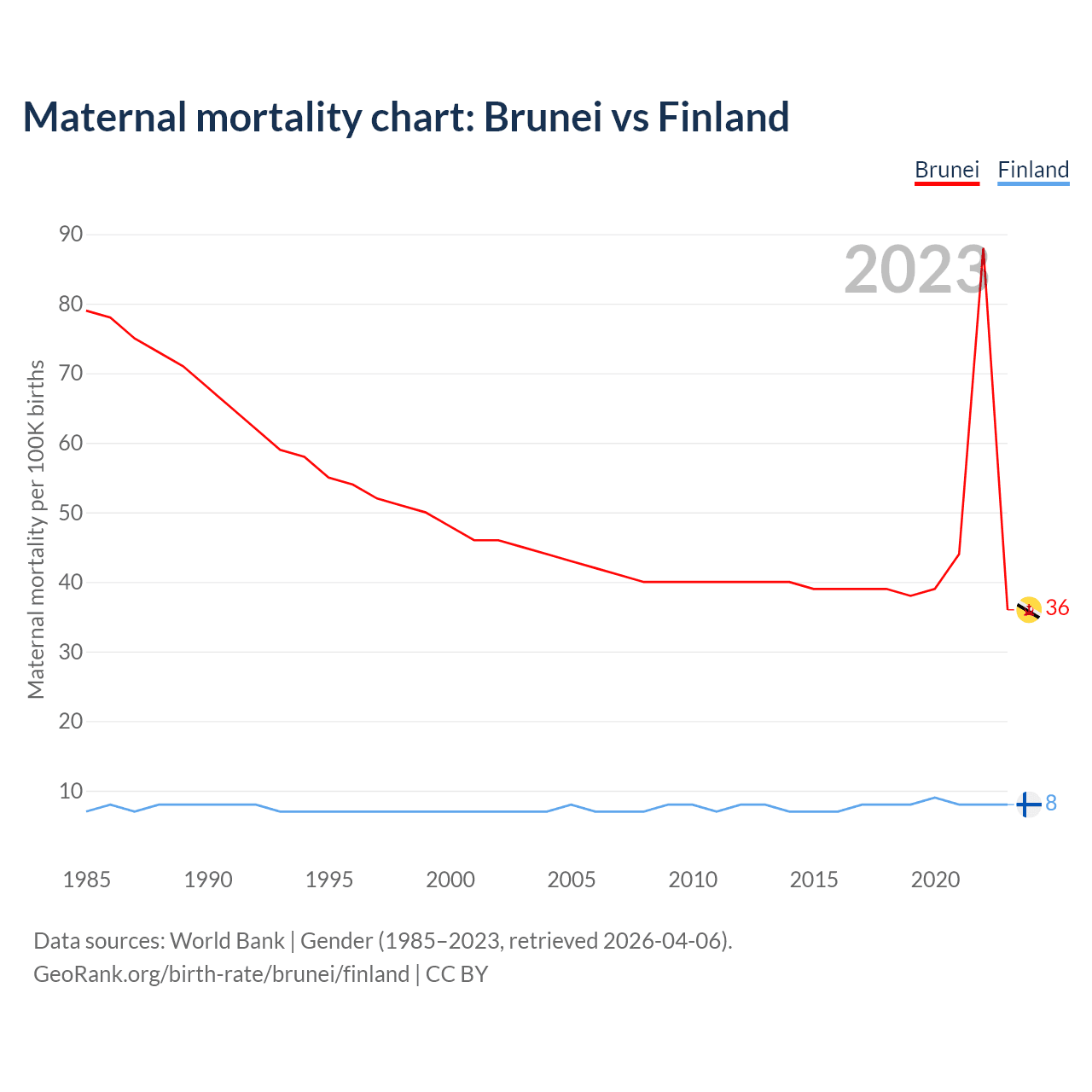 The maternal mortality rate, which is the probability of dying during childbirth or within 42 days of pregnancy termination, is 36 deaths per 100,000 live births in Brunei, compared to 8 deaths in Finland.