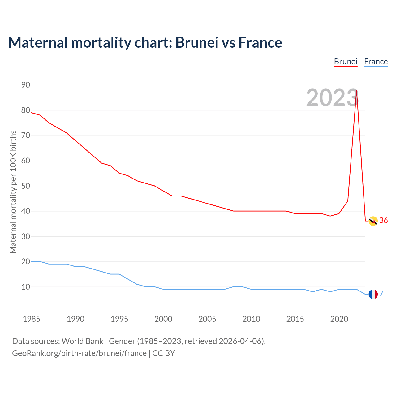 The maternal mortality rate, which is the probability of dying during childbirth or within 42 days of pregnancy termination, is 36 deaths per 100,000 live births in Brunei, compared to 7 deaths in France.