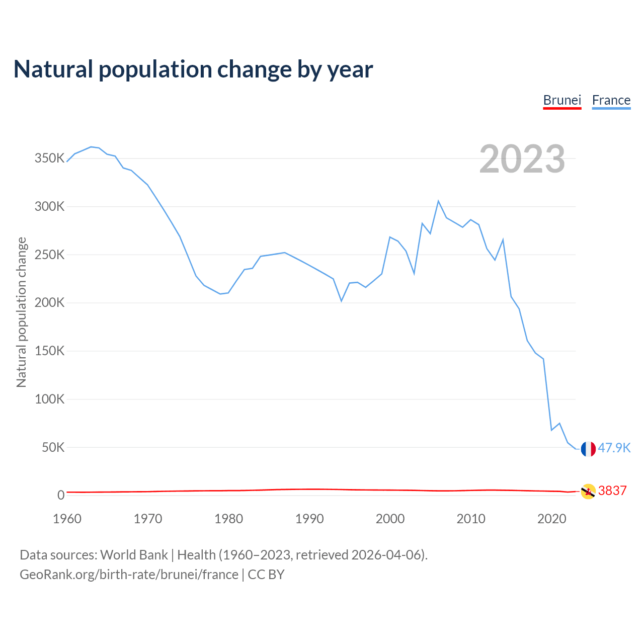 Brunei has an annual birth rate of 13.6 births per 1,000 people, compared to 9.9 for France. The average number of children a woman is expected to have during her lifetime — the fertility rate, is 1.75 in Brunei and 1.66 in France — 4.98% difference.