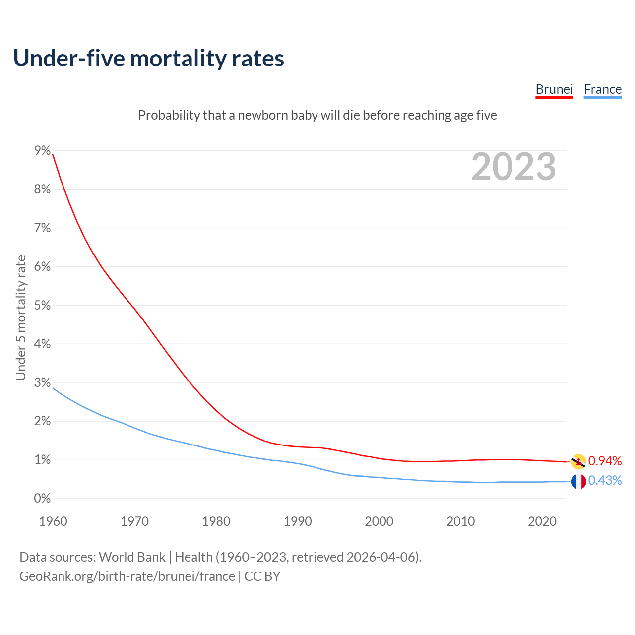 The chance that a newborn baby will die before reaching age five is 0.94% in Brunei and 0.43% in France. Above is a chart with historical data on under-five mortality rates.