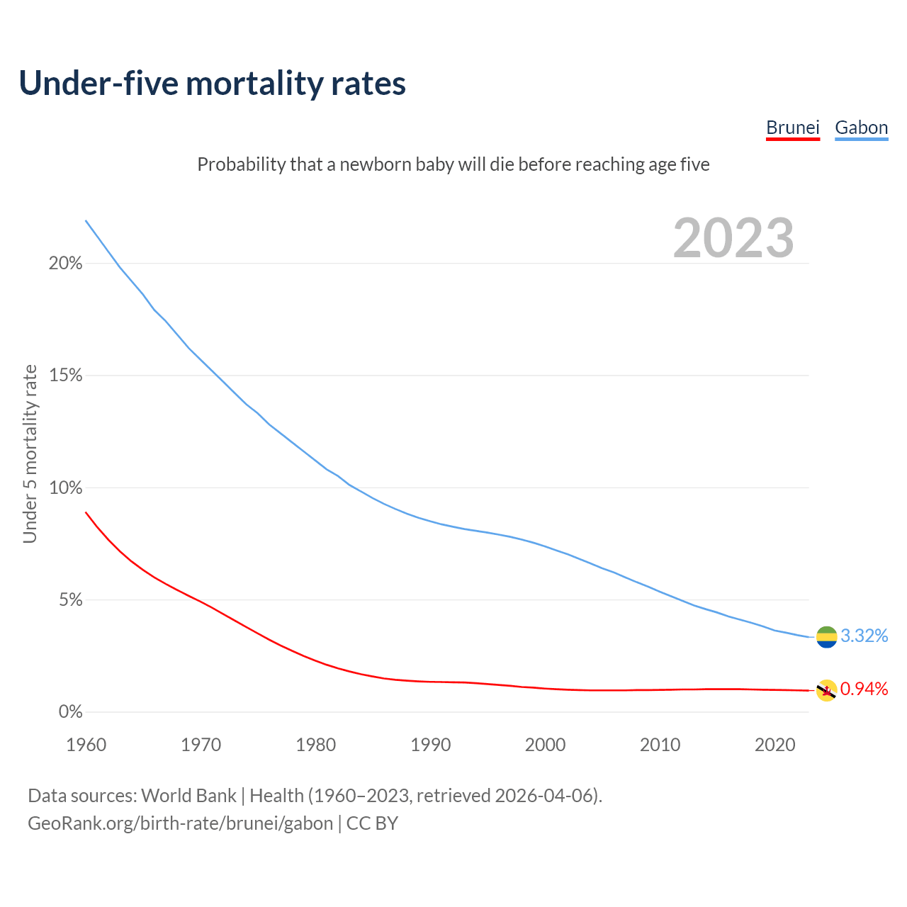 The chance that a newborn baby will die before reaching age five is 0.94% in Brunei and 3.32% in Gabon. Above is a chart with historical data on under-five mortality rates.