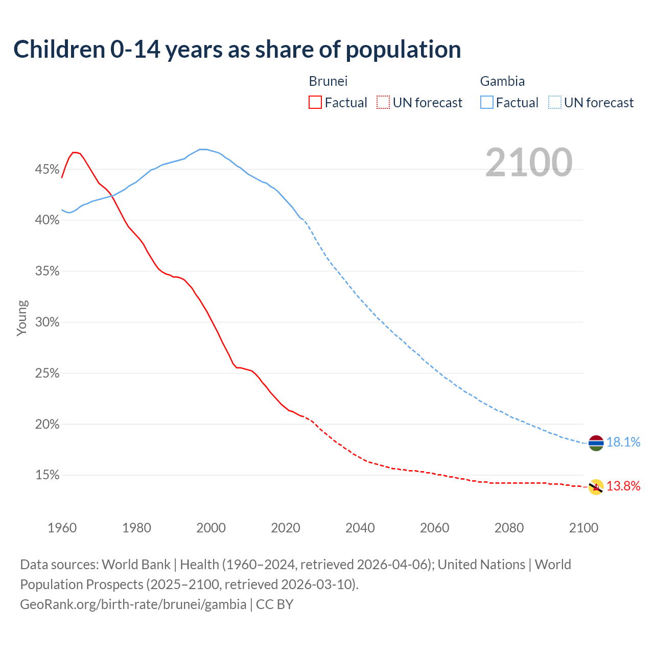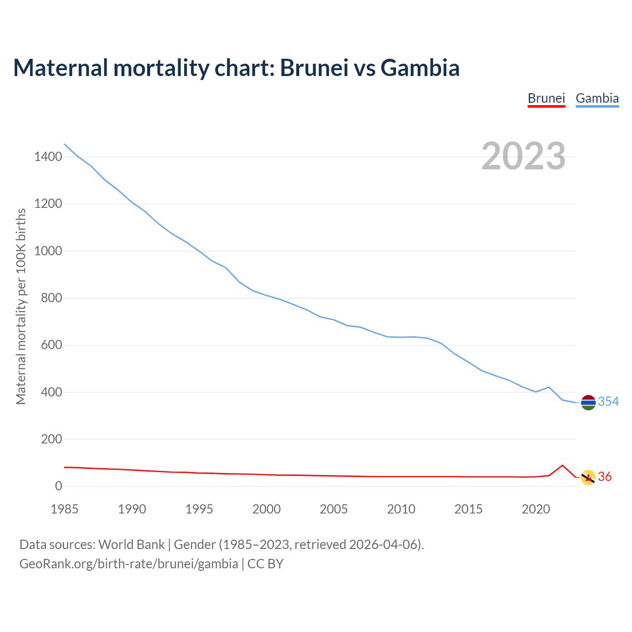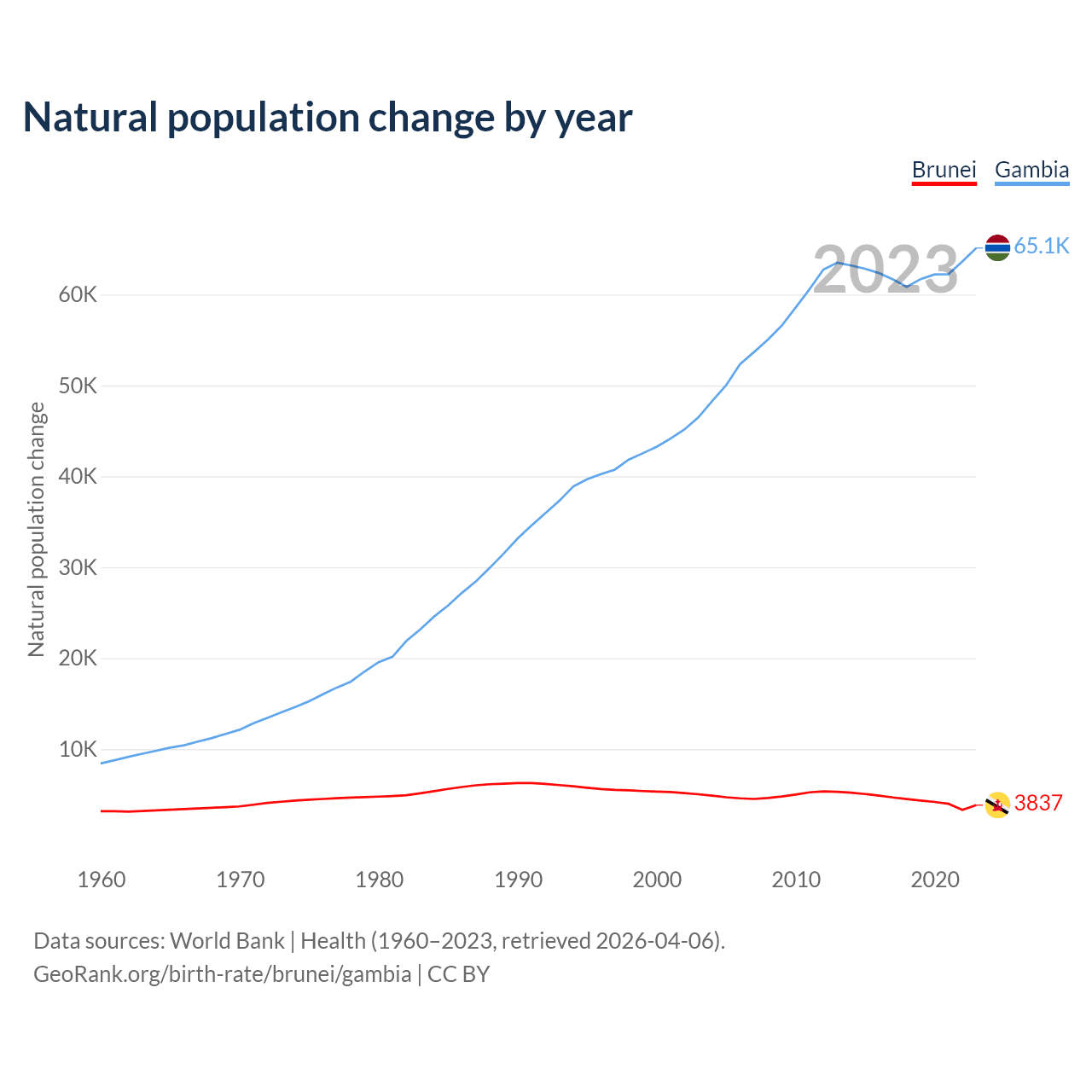 Brunei has an annual birth rate of 13.6 births per 1,000 people, compared to 30.4 for the Gambia. The average number of children a woman is expected to have during her lifetime — the fertility rate, is 1.75 in Brunei and 4.01 in the Gambia — 129.3% difference.