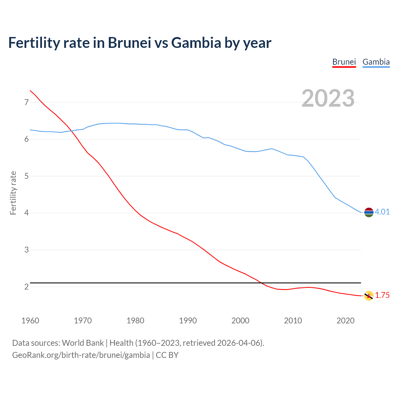 According to the latest available data on birth rates, the fertility rate in Brunei was 1.75 children per woman in 2023, compared to 4.01 in the Gambia in 2023. The replacement level is considered to be 2.1 children per woman.