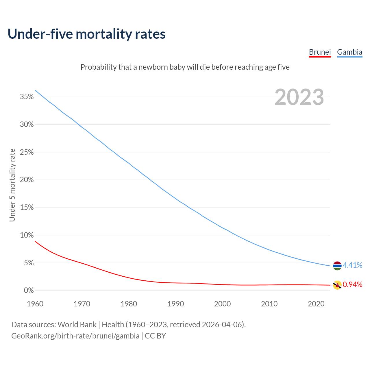 The chance that a newborn baby will die before reaching age five is 0.94% in Brunei and 4.41% in the Gambia. Above is a chart with historical data on under-five mortality rates.